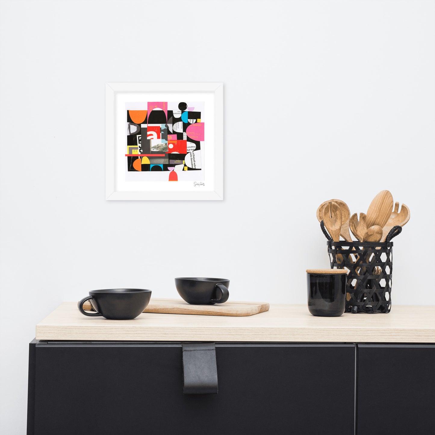 These are handmade, living pieces, many with overhanging elements from the collage assembly and the pieces are mounted in a slightly raised fashion (so as to appear floating) above a white, acid-free matte. We use Museum Glass, specially coated to make the viewing of the art completely glare and reflection-free (it looks like there is no glass; all you see is the artwork), as well as being 92% UV filtering (a very important feature, due to the use of fragile, paper ephemera).