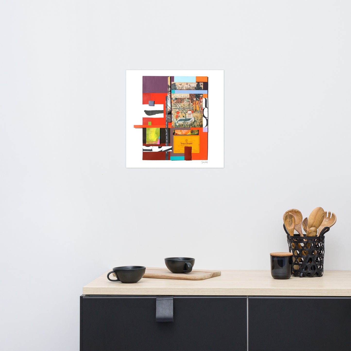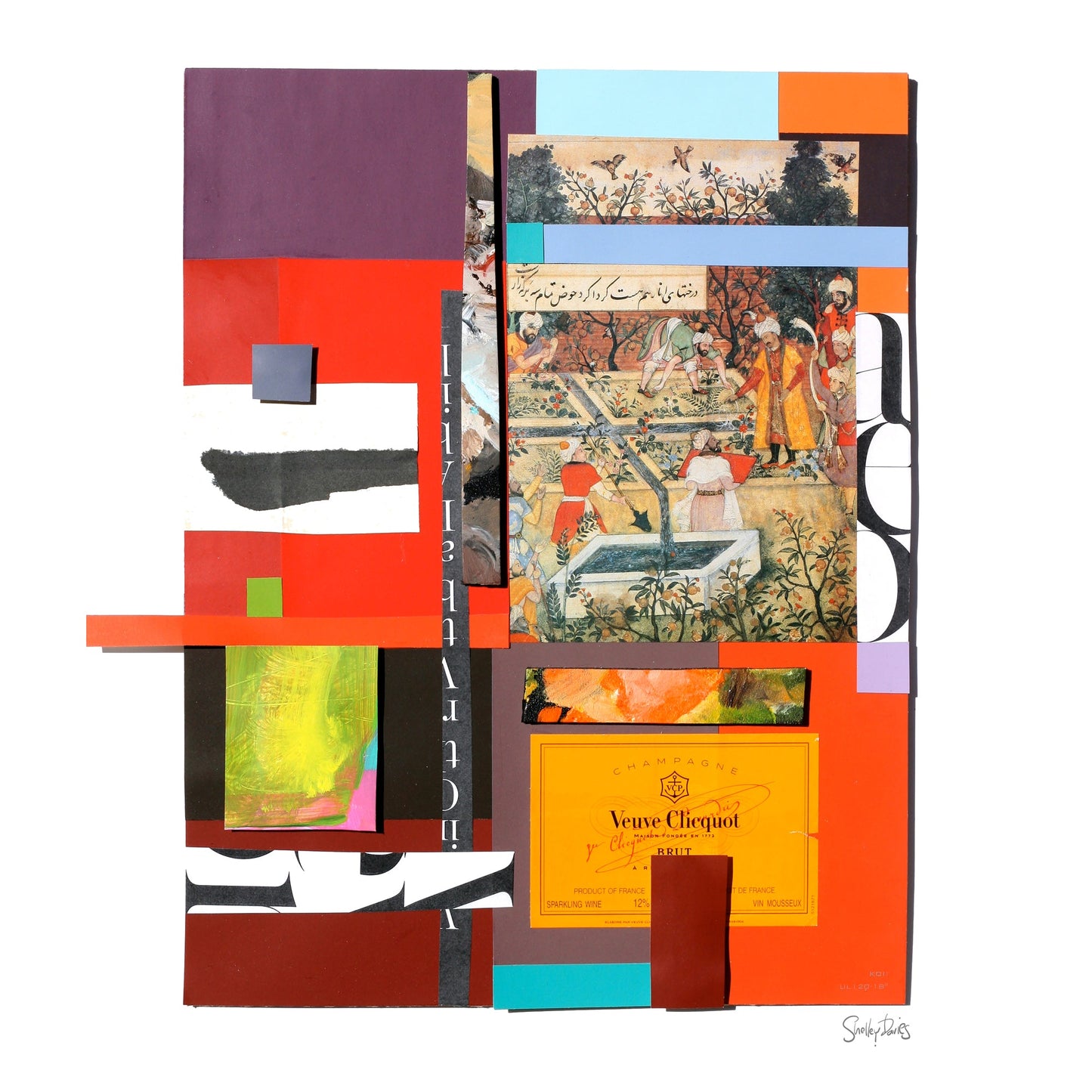 The beautiful orange of a champagne label echoes the gorgeous saffron robes of a 16th century Persian, wandering through his well-tended orange groves. Glimpses of typography hinting at narratives within this walled composition, with the surrounding rich colours adds to the sumptuousness of a grand Persian garden.