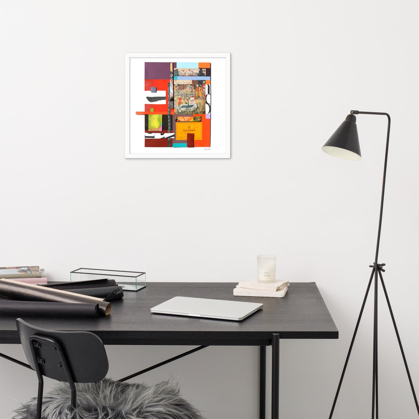 These are handmade, living pieces, many with overhanging elements from the collage assembly and the pieces are mounted in a slightly raised fashion (so as to appear floating) above a white, acid-free matte. We use Museum Glass, specially coated to make the viewing of the art completely glare and reflection-free (it looks like there is no glass; all you see is the artwork), as well as being 92% UV filtering (a very important feature, due to the use of fragile, paper ephemera).