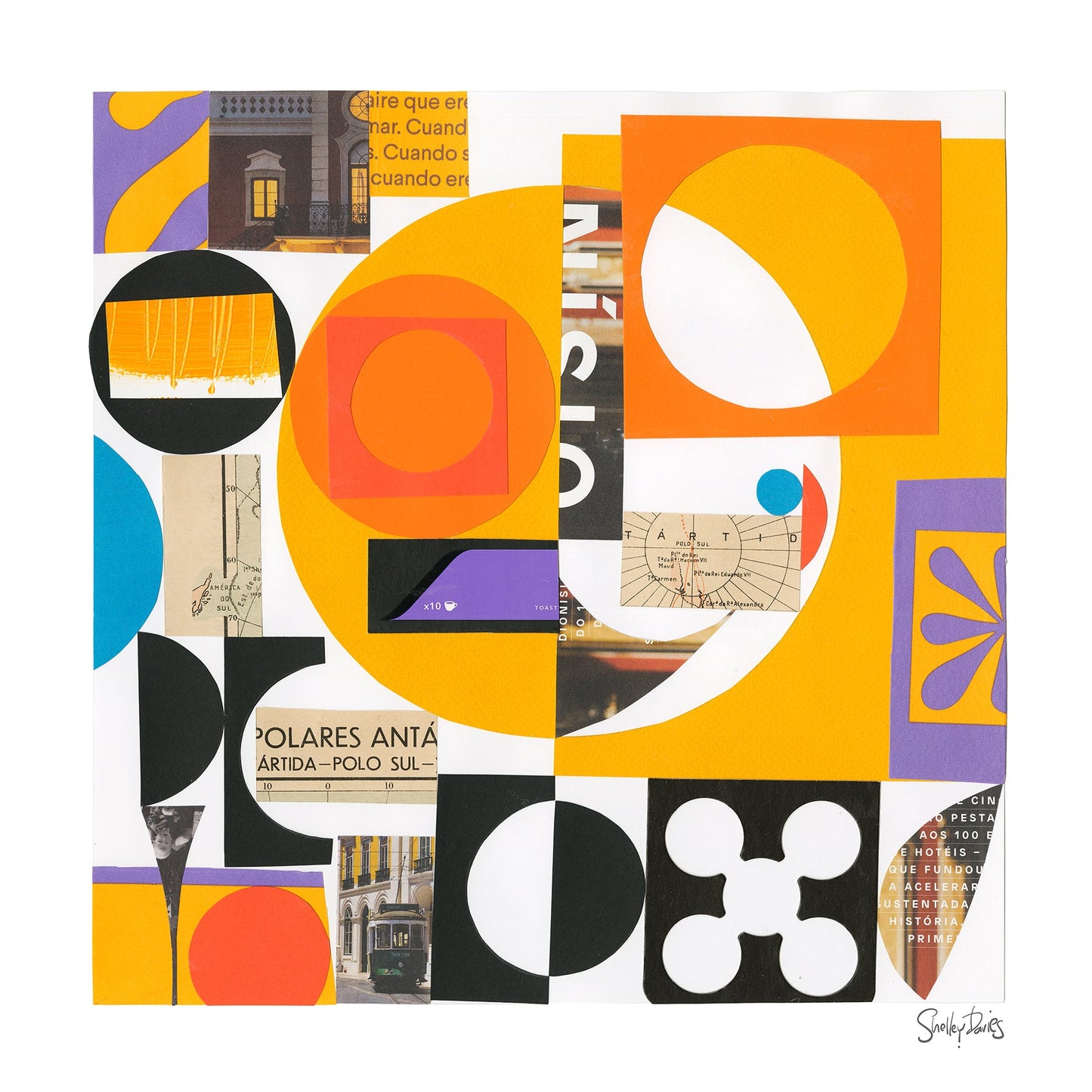 Bits of a vintage Portuguese atlas, globe-shaped circles and exploration were the starting point for this handmade paper collage. Glimpses of Lisbon architecture and its vibrant, signature yellow, in concert with the atlas, evokes the adventurous spirit of Portuguese history. Images of Lisbon, coffee packaging, bold colours and shapes create a vibrant, visual rhythm.