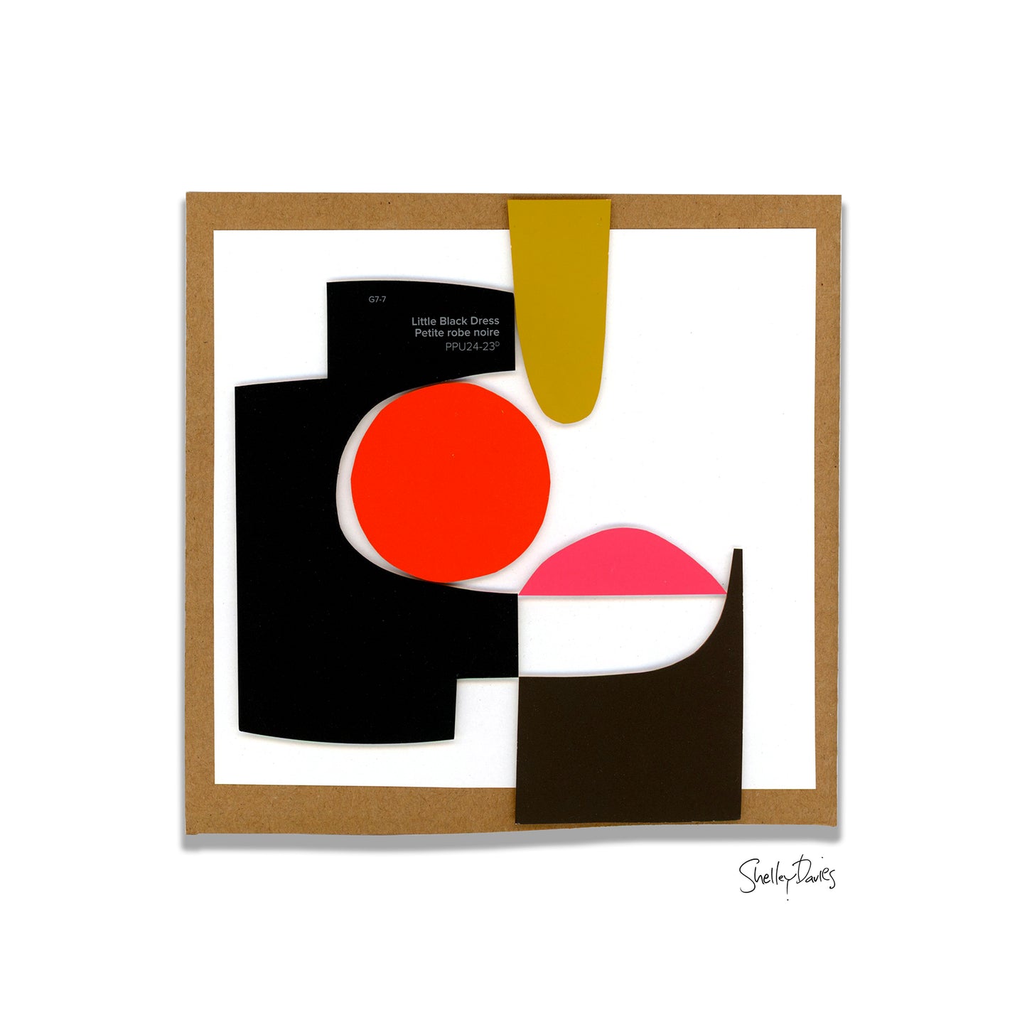 This little maquette was created on a cardboard base, with an acid-free white background and raised paper elements (cut paint chips), all measuring 6.5” x 6”. This will be mounted on an acid-free illustration board measuring 9”x9”, with the artist’s signature just below the mounted collage.