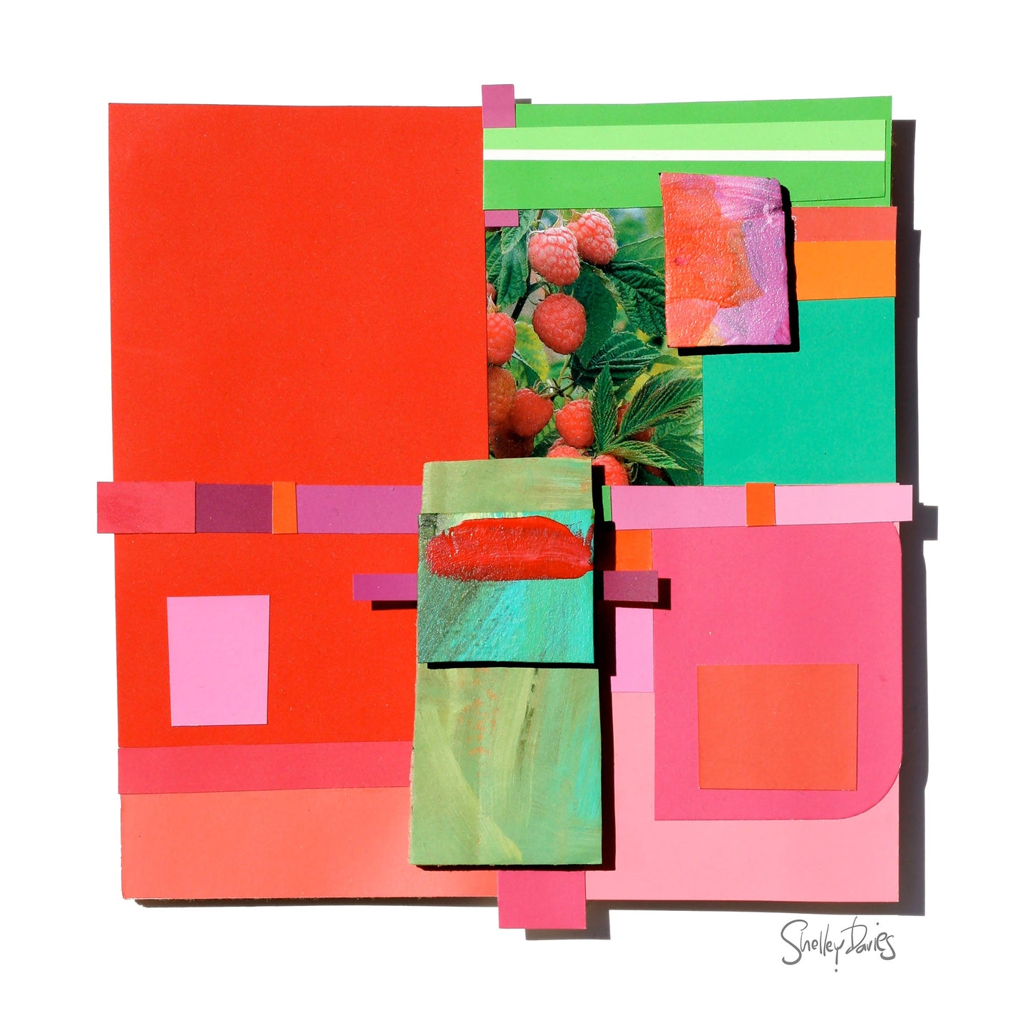 This 3D collage is an amalgamation of my paint palette bits, commercial paint chips and an image of a beautiful red raspberry. I'm aiming for vibrancy in this piece, both with colour and composition.