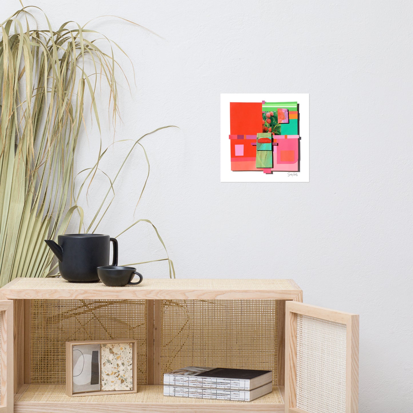 This mixed media collage is a 3-dimensional work, built up from paint chips, vintage hand-written letters, copies of textile fragments, scraps of brightly coloured paint palettes and black ink drawings. Shelley likes building up surfaces, starting with a cardboard structure, and then adding elements until they take on an architectural quality, giving the viewer a peek down a hidden corner of colour, a hallway of intrigue, typography, textiles and pattern to tell its story.