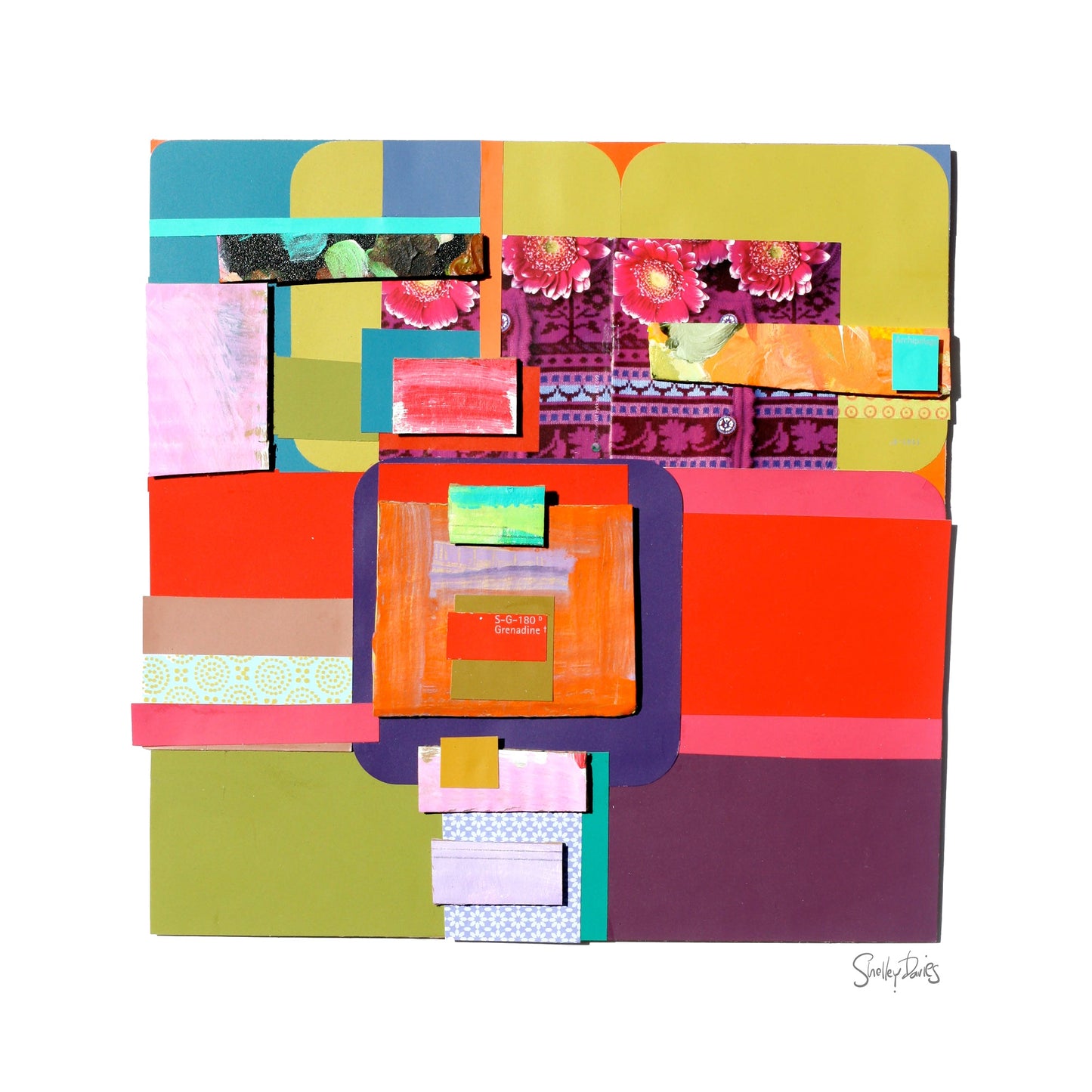 This mixed media collage is a 3-dimensional work, built up from paint chips, vintage hand-written letters, copies of textile fragments, scraps of brightly coloured paint palettes and black ink drawings. Shelley likes building up surfaces, starting with a cardboard structure, and then adding elements until they take on an architectural quality, giving the viewer a peek down a hidden corner of colour, a hallway of intrigue, typography, textiles and pattern to tell its story.