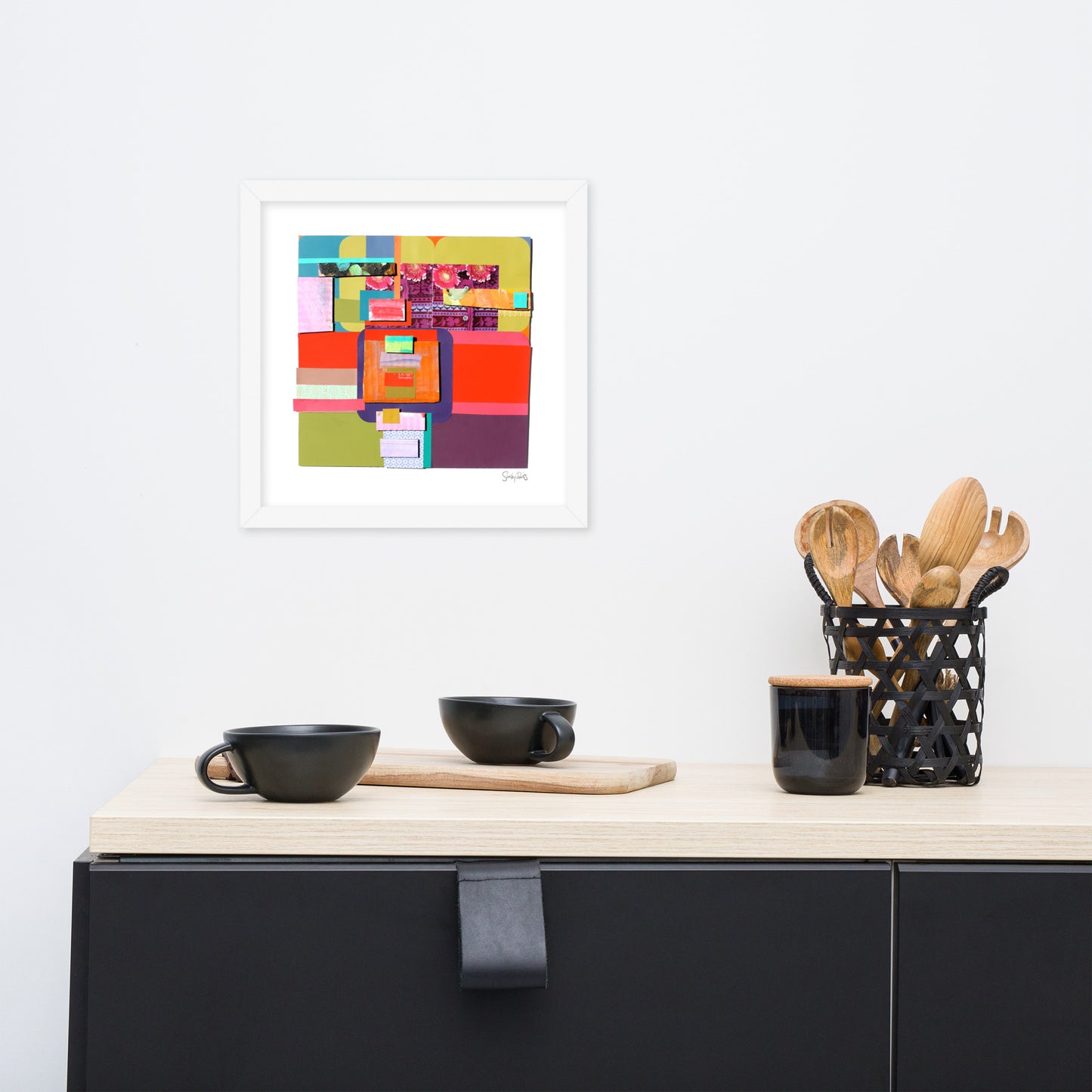 These are handmade, living pieces, many with overhanging elements from the collage assembly and the pieces are mounted in a slightly raised fashion (so as to appear floating) above a white, acid-free matte. We use Museum Glass, specially coated to make the viewing of the art completely glare and reflection-free (it looks like there is no glass; all you see is the artwork), as well as being 92% UV filtering (a very important feature, due to the use of fragile, paper ephemera).