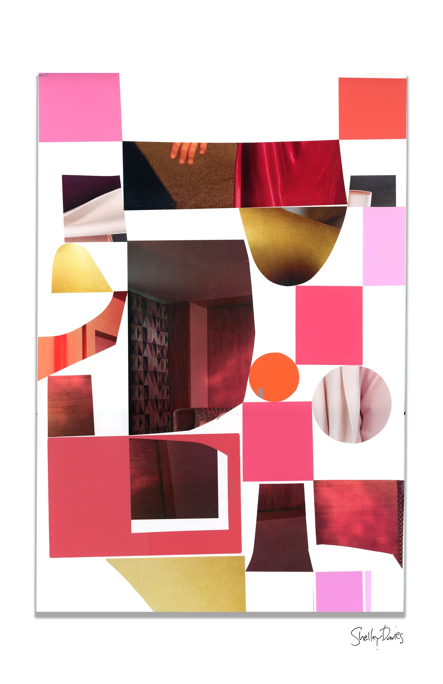 A warm assortment of reds, pinks, burgundy and ochre come together here in a pleasing juxtaposition of colours and shapes, using bits of photographic images, paint chips (one of which which lent its name to this composition) and hand-cut papers, creating a unique rhythm all its own.