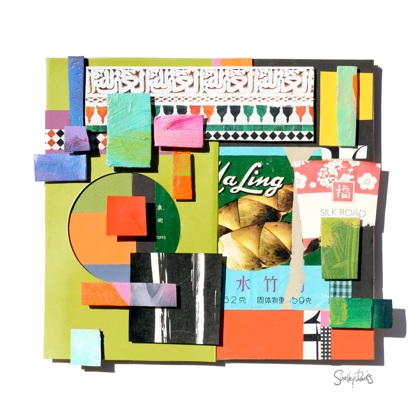 This 3D collage percolates with colours and images: that of a carved stone wall, a label from a Chinese vegetable can, bits of typography and a paper tea cup with the inscription 'Silk Road'.