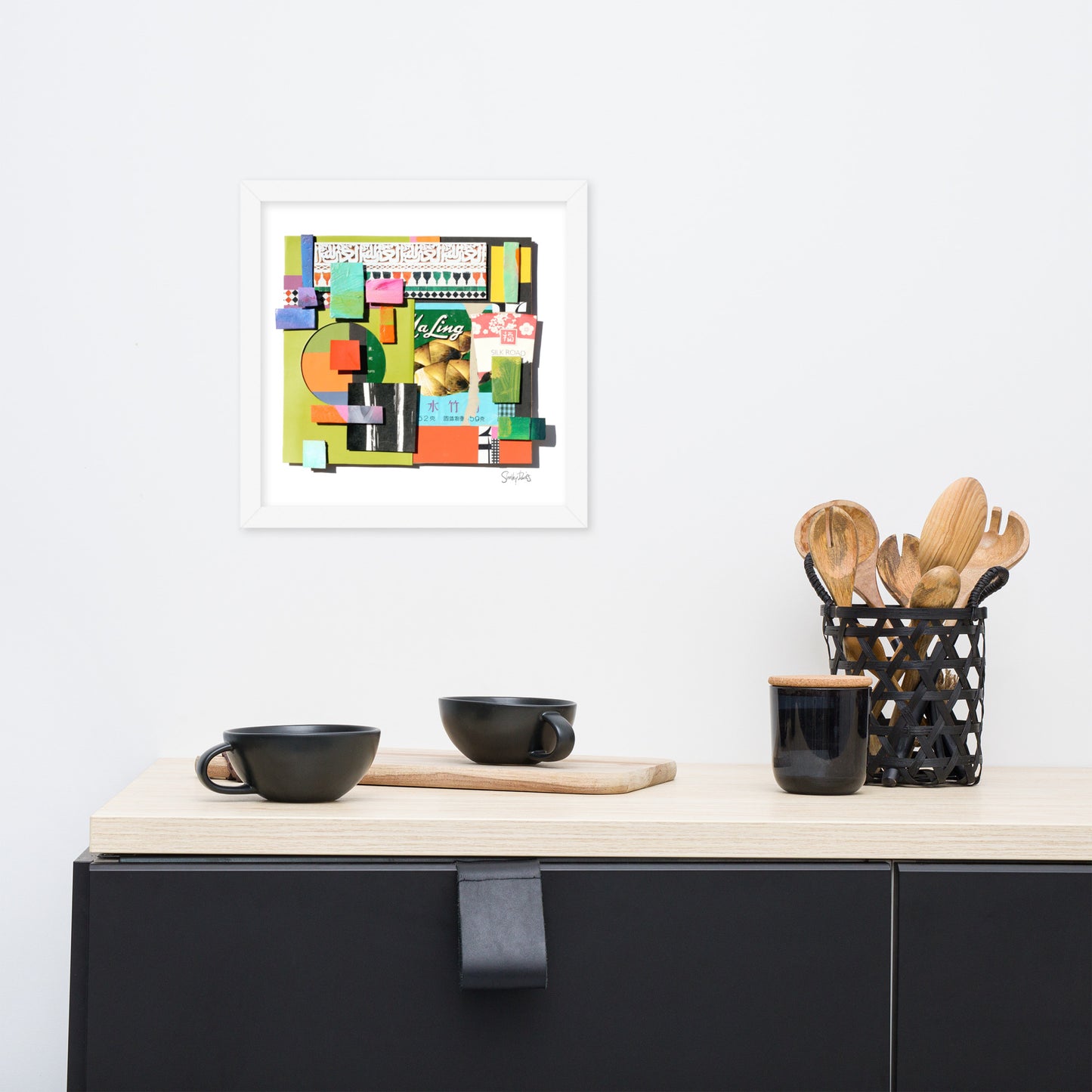 These are handmade, living pieces, many with overhanging elements from the collage assembly and the pieces are mounted in a slightly raised fashion (so as to appear floating) above a white, acid-free matte. We use Museum Glass, specially coated to make the viewing of the art completely glare and reflection-free (it looks like there is no glass; all you see is the artwork), as well as being 92% UV filtering (a very important feature, due to the use of fragile, paper ephemera).