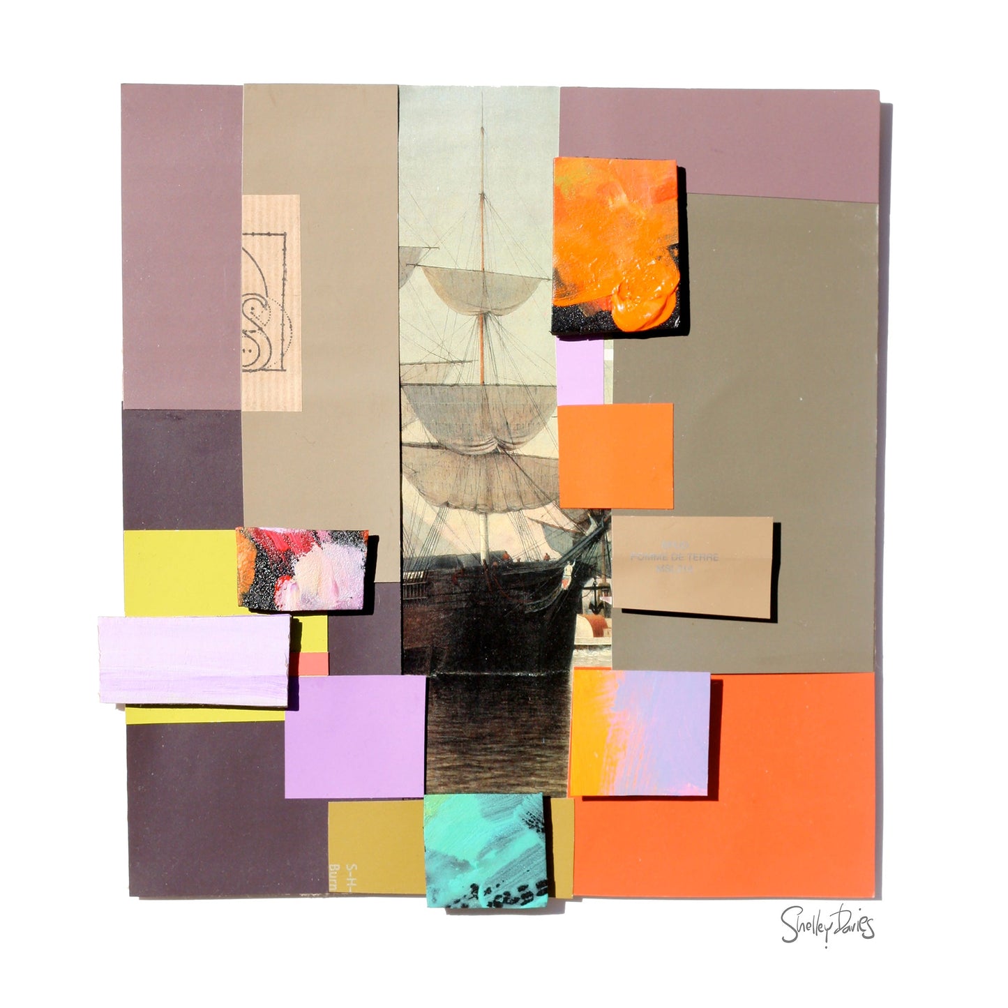 This mixed media collage is a 3-dimensional work, built up from paint chips, vintage hand-written letters, copies of textile fragments, scraps of brightly coloured paint palettes and black ink drawings. Shelley likes building up surfaces, starting with a cardboard structure, and then adding elements until they take on an architectural quality, giving the viewer a peek down a hidden corner of colour, a hallway of intrigue, typography, textiles and pattern to tell its story.