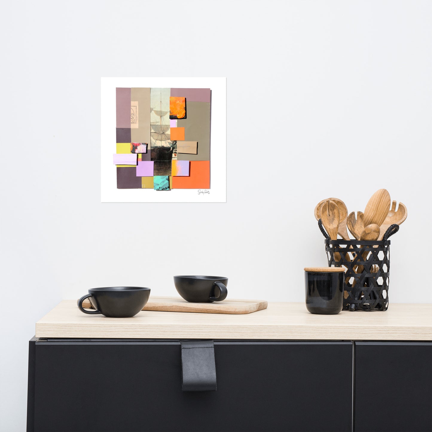 These are handmade, living pieces, many with overhanging elements from the collage assembly and the pieces are mounted in a slightly raised fashion (so as to appear floating) above a white, acid-free matte. We use Museum Glass, specially coated to make the viewing of the art completely glare and reflection-free (it looks like there is no glass; all you see is the artwork), as well as being 92% UV filtering (a very important feature, due to the use of fragile, paper ephemera).