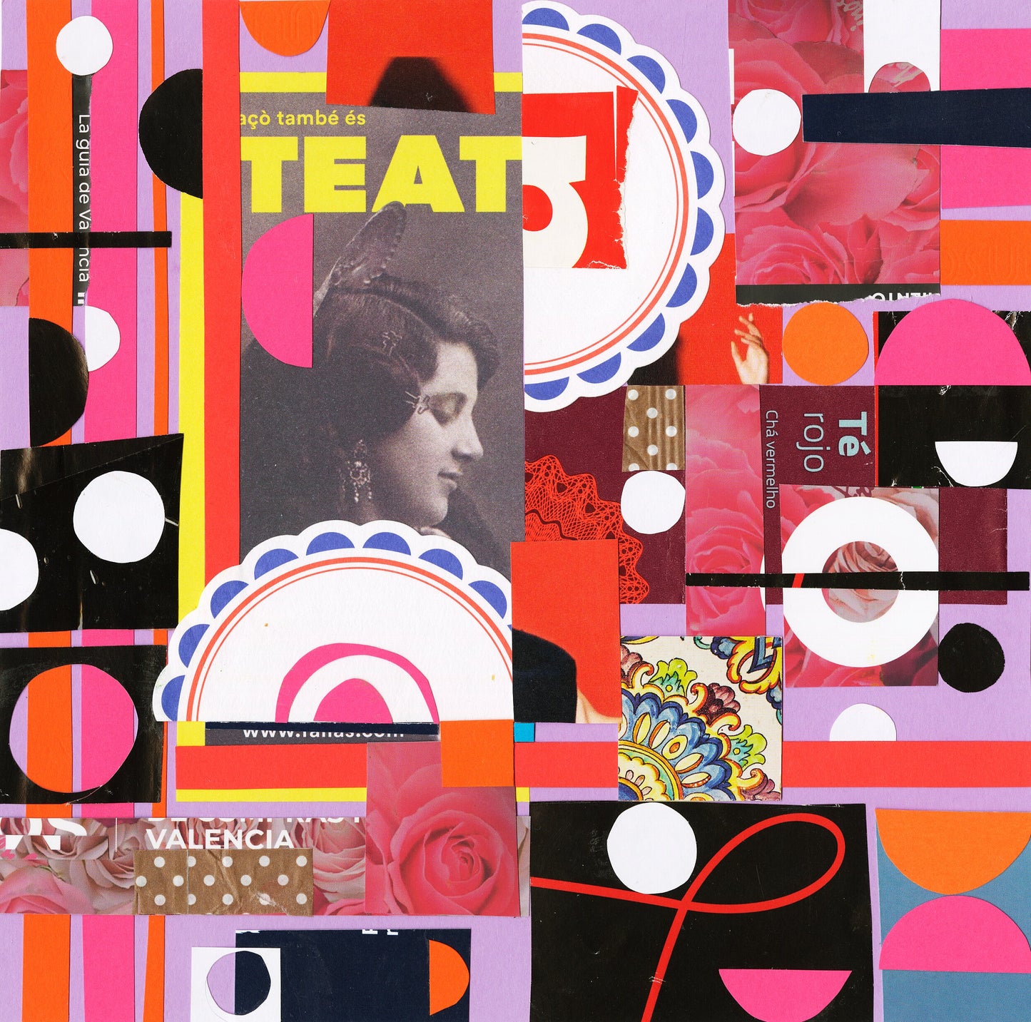 The starting point for this collage was a handbill with a vintage photograph of a flamenco dancer on it, advertising a theatrical performance in Valencia. A paper coaster evokes a lady's fan; roses and polka dots added to the vintage Spanish vibe, and vibrant colours complete the overall effect of a colourful, dramatic life.