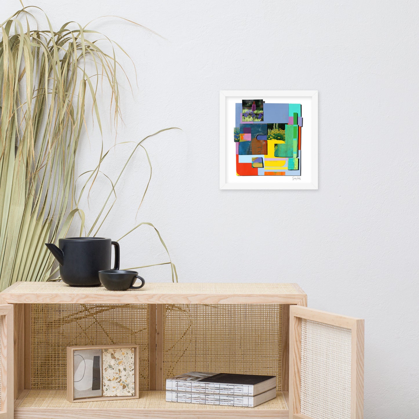 These are handmade, living pieces, many with overhanging elements from the collage assembly and the pieces are mounted in a slightly raised fashion (so as to appear floating) above a white, acid-free matte. We use Museum Glass, specially coated to make the viewing of the art completely glare and reflection-free (it looks like there is no glass; all you see is the artwork), as well as being 92% UV filtering (a very important feature, due to the use of fragile, paper ephemera).