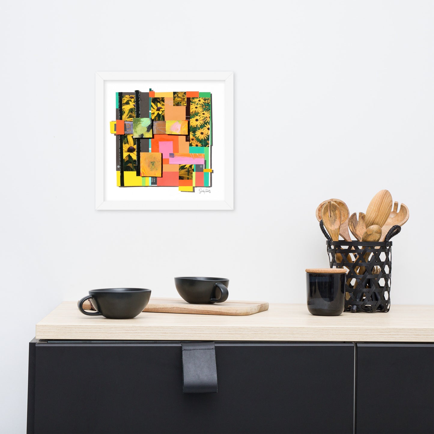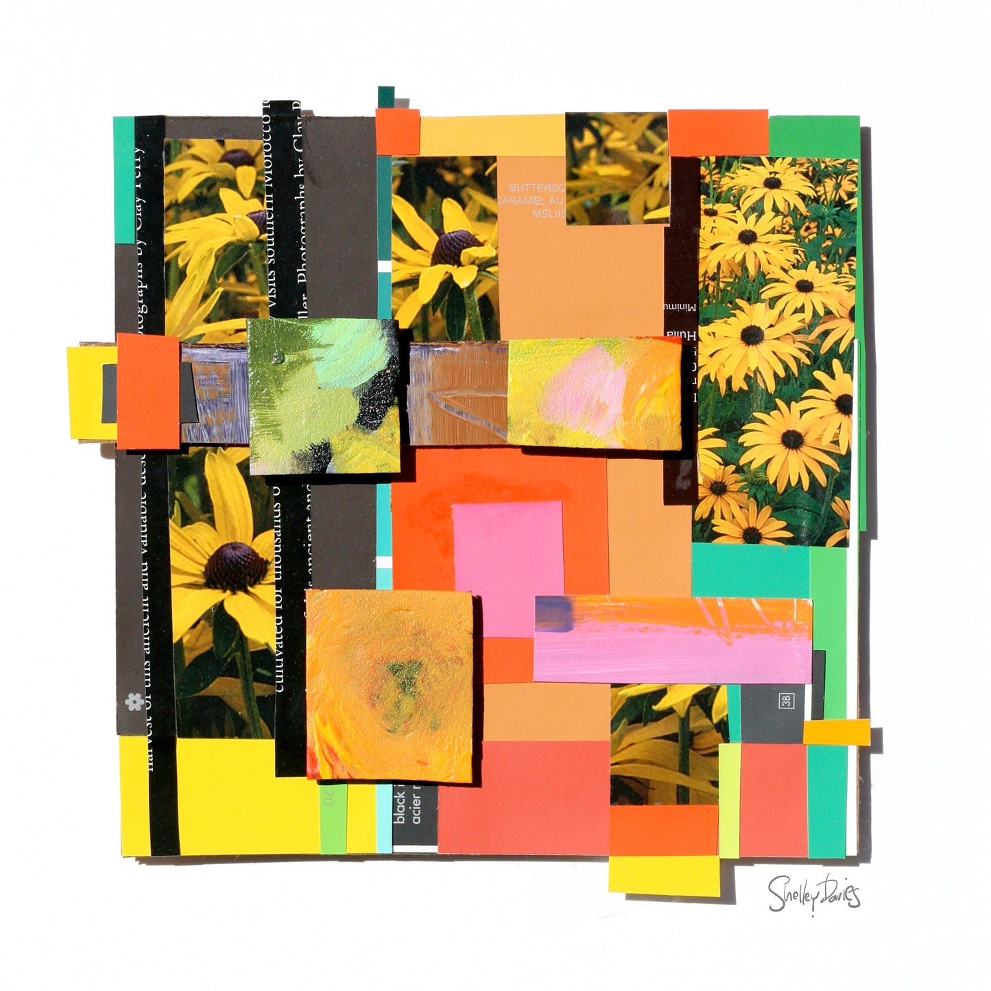 This 3D paper and ink collage was created using the bold colours of paint chips and the swirling colours from my cut-up paint palettes. I love throwing in glimpses of typography to compliment the bold colours, creating a punchy, contemporary composition. My use of materials is deliberately humble because I want to illustrate that art can be made with simple materials and still create magic. 'Butterscotch' is composed of cardboard and paper, mounted on bright white acid-free illustration board.