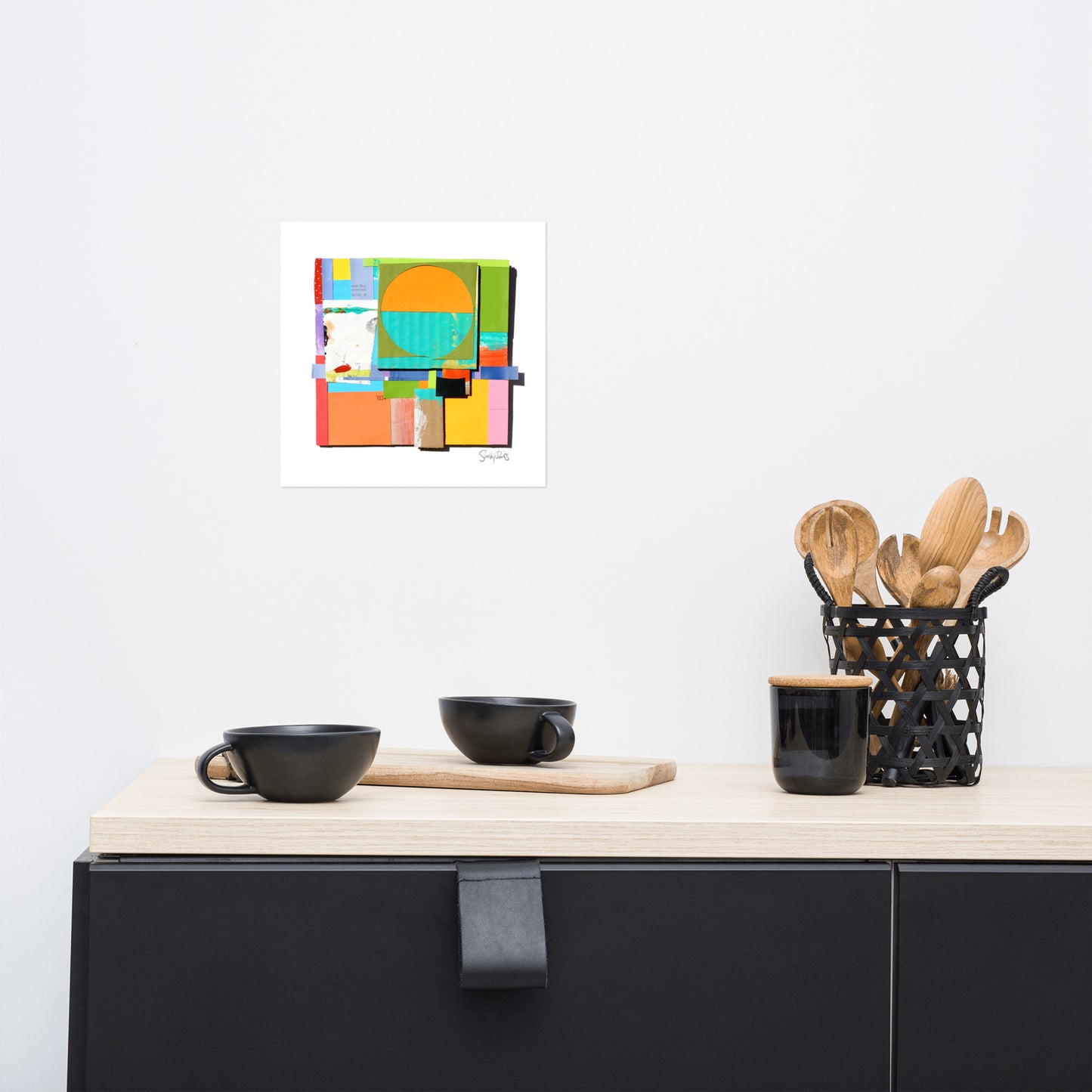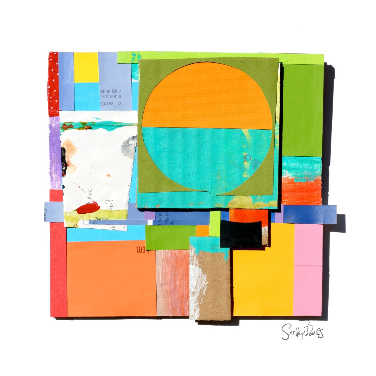 This mixed media collage is a 3-dimensional work, built up from paint chips, vintage hand-written letters, copies of textile fragments, scraps of brightly coloured paint palettes and black ink drawings. Shelley likes building up surfaces, starting with a cardboard structure, and then adding elements until they take on an architectural quality, giving the viewer a peek down a hidden corner of colour, a hallway of intrigue, typography, textiles and pattern to tell its story.