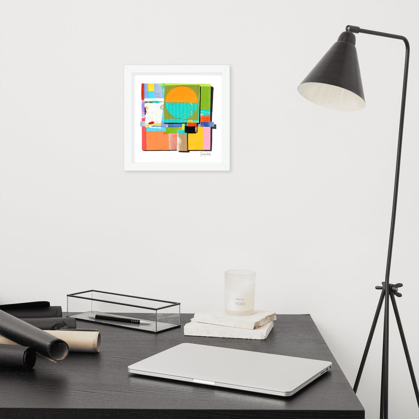 These are handmade, living pieces, many with overhanging elements from the collage assembly and the pieces are mounted in a slightly raised fashion (so as to appear floating) above a white, acid-free matte. We use Museum Glass, specially coated to make the viewing of the art completely glare and reflection-free (it looks like there is no glass; all you see is the artwork), as well as being 92% UV filtering (a very important feature, due to the use of fragile, paper ephemera).