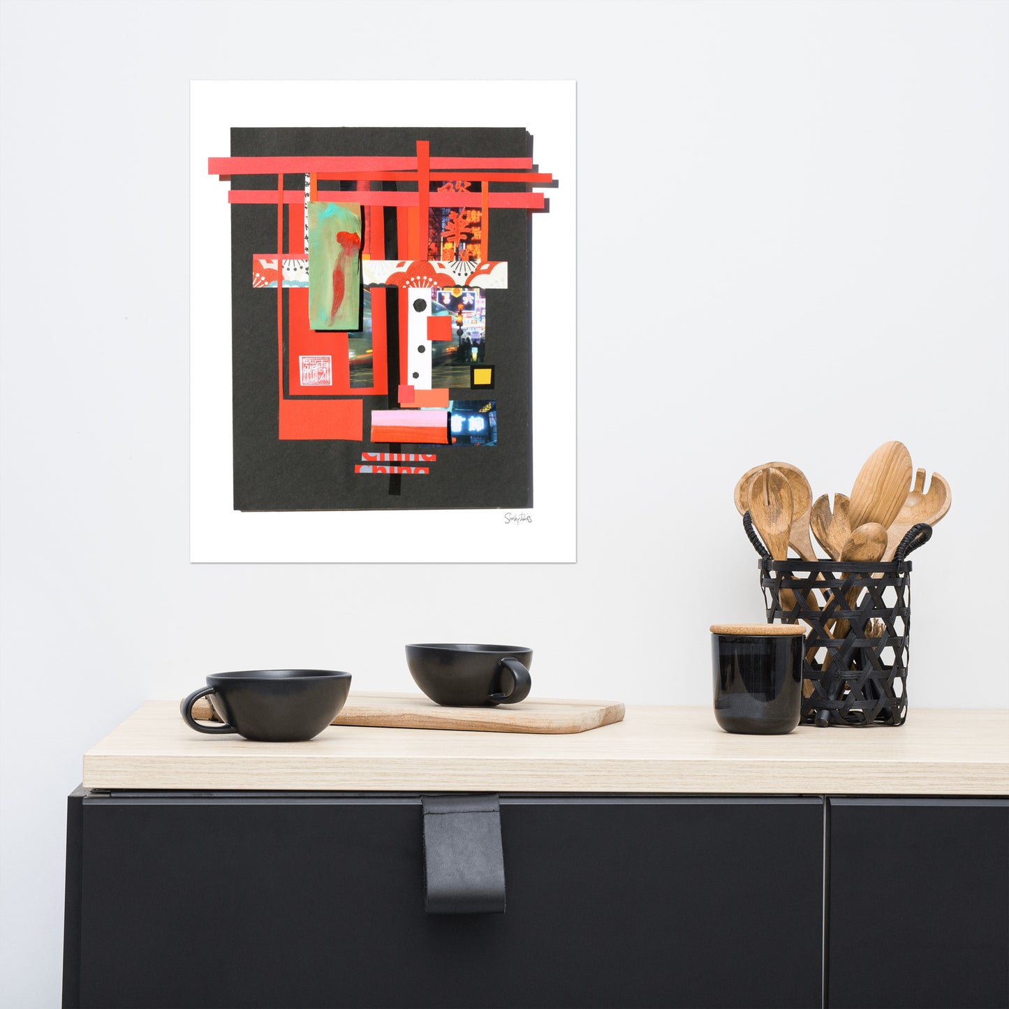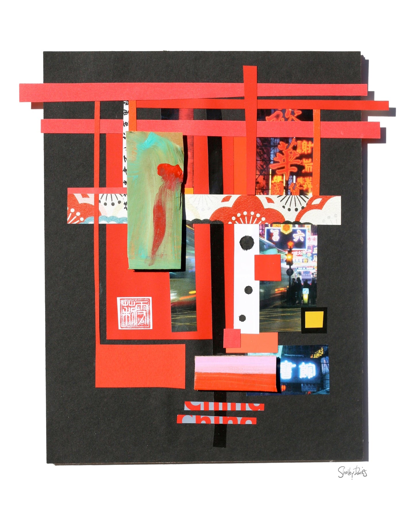 This 3D collage takes the theme of China as its jumping-off point. I've used pattern, photographs (of night scenes in Chinatown), calligraphy, paint chips, pieces of paint palettes and my personal red chop mark (which says 'Shelley') to create a work with a slightly architectural feel to it, as well as invoking a Chinese theme.