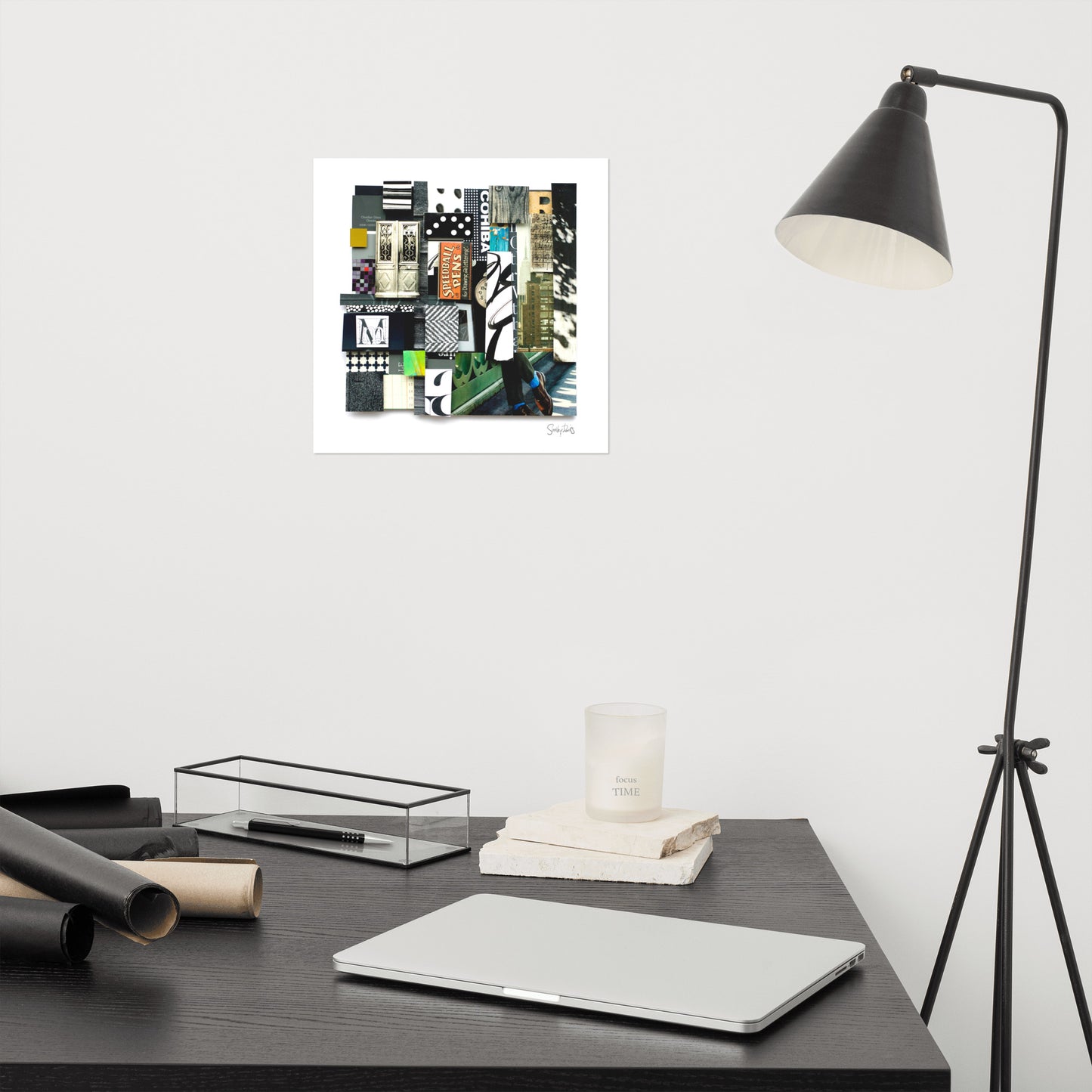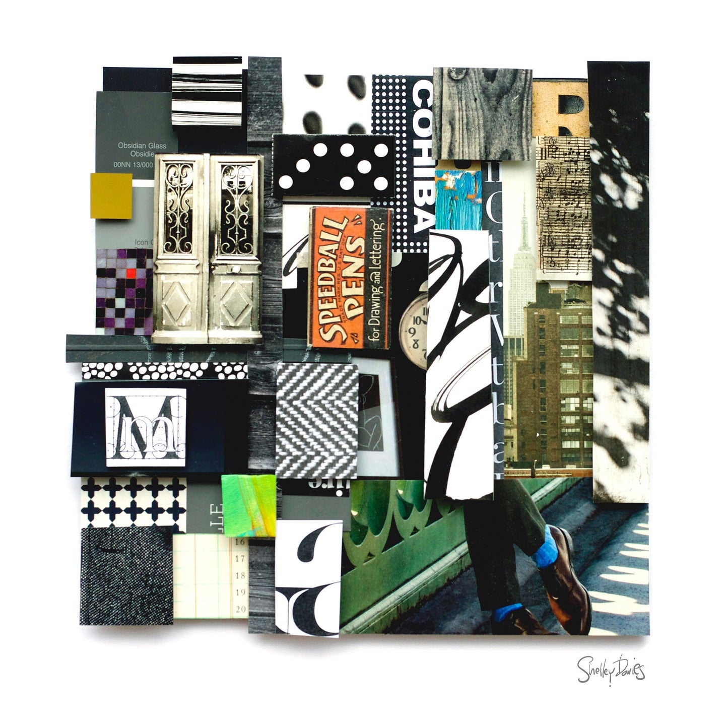 This 3D collage is an amalgamation of architectural elements, typography, textures, menswear (tweed samples, brown brogues and oh, those blue socks!) and paint chips. I've snuck in images of the Empire State Building, a vintage ledger sheet, an alarm clock face, a wall of shadows and a tiny black and white drawing by Matisse. There is a lot happening in this small collage! The name 'Cohiba' comes from the typography from a cigar box lid.