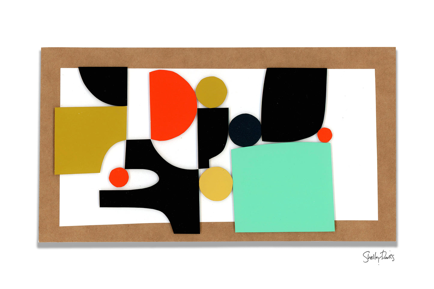 An original 3D paper collage using the colour turmeric and mid-century design inspiration. The title comes from the song ‘Take Five’ (written by Paul Desmond) from Dave Brubeck’s seminal album from 1959, the Dave Brubeck Quartet’s ‘Time Out’.