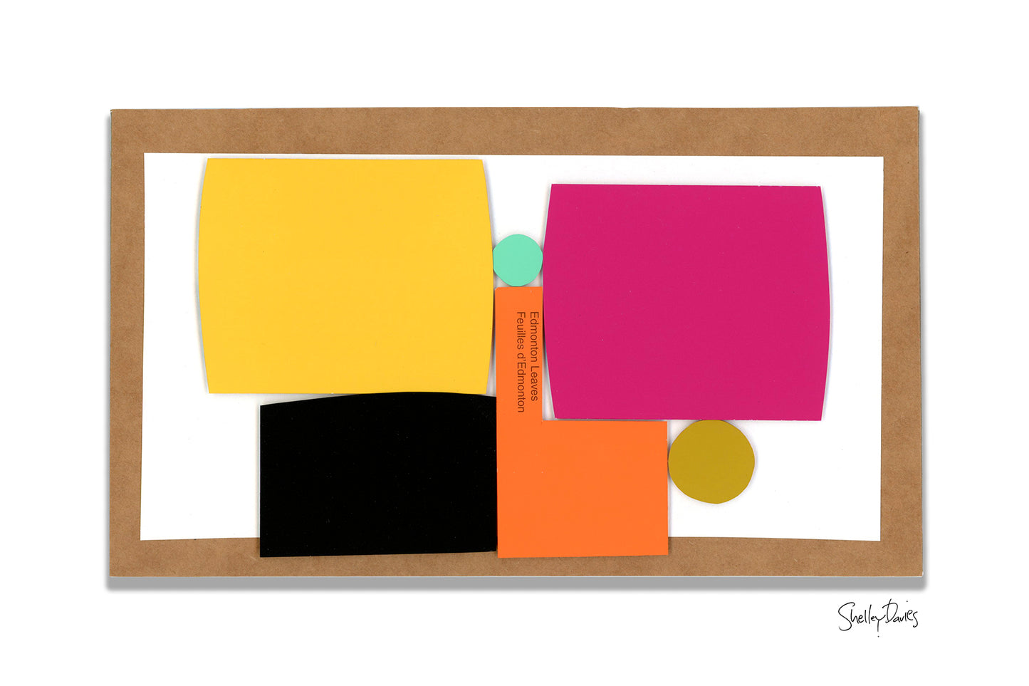 This little maquette was created on a cardboard base, with an acid-free white background and raised paper elements (cut paint chips), all measuring 10.5” x 5.5”. This will be mounted on an acid-free illustration board measuring 12.25" x 16.25”, with the artist’s signature just below the mounted collage.