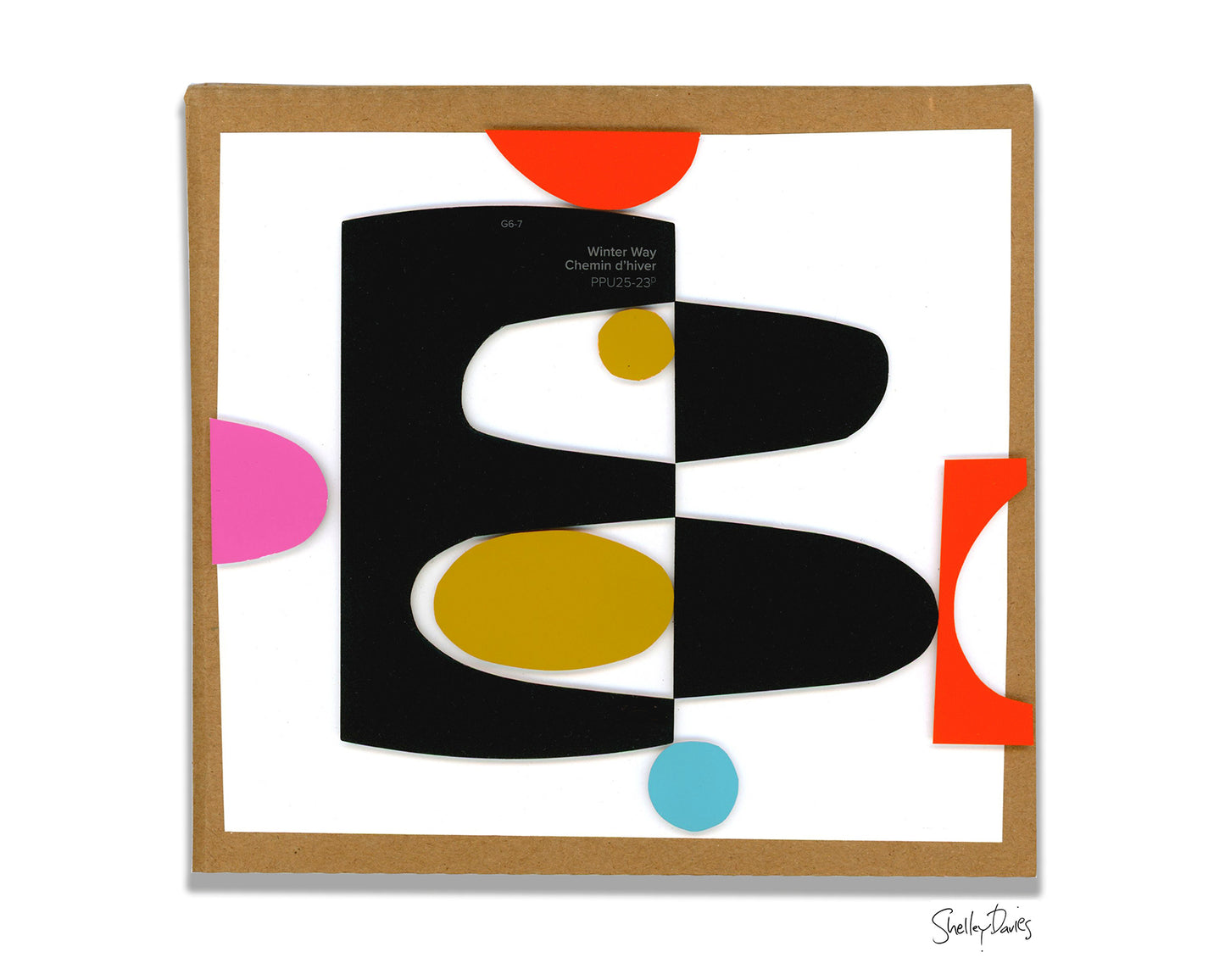 This little maquette was created on a cardboard base, with an acid-free white background and raised paper elements (cut paint chips), all measuring 7” x 6.5”. This will be mounted on an acid-free illustration board measuring 9”x9”, with the artist’s signature just below the mounted collage.