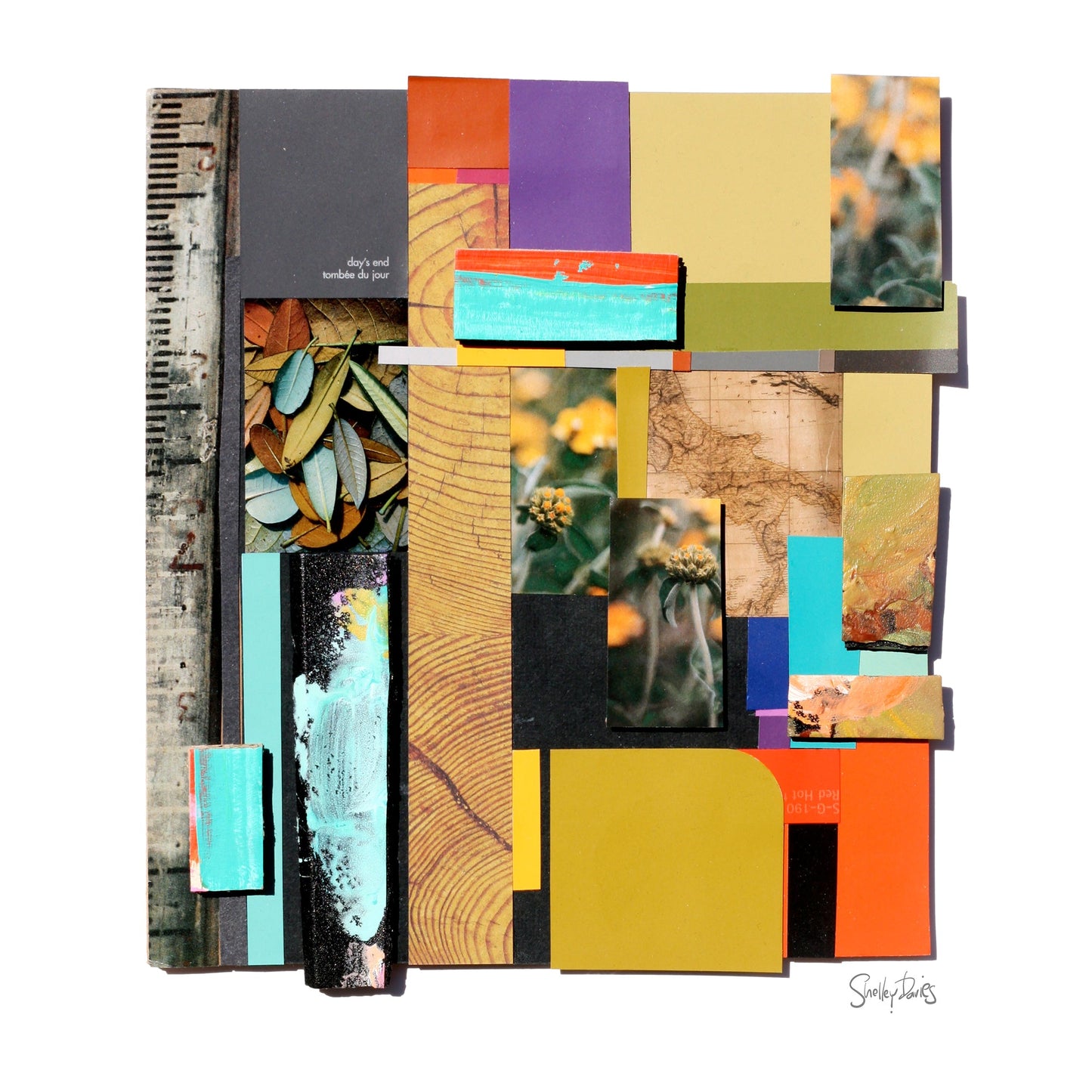 This 3D collage is a collection of images of wood, leaves, and interesting colours from paint chips and paint palettes. On the left is an image of a surveyor's weathered measurement stick. The name 'Day's End' comes from the name of a paint sample, included in the collage. I've also snuck in a small, vintage map of Italy, just for fun.