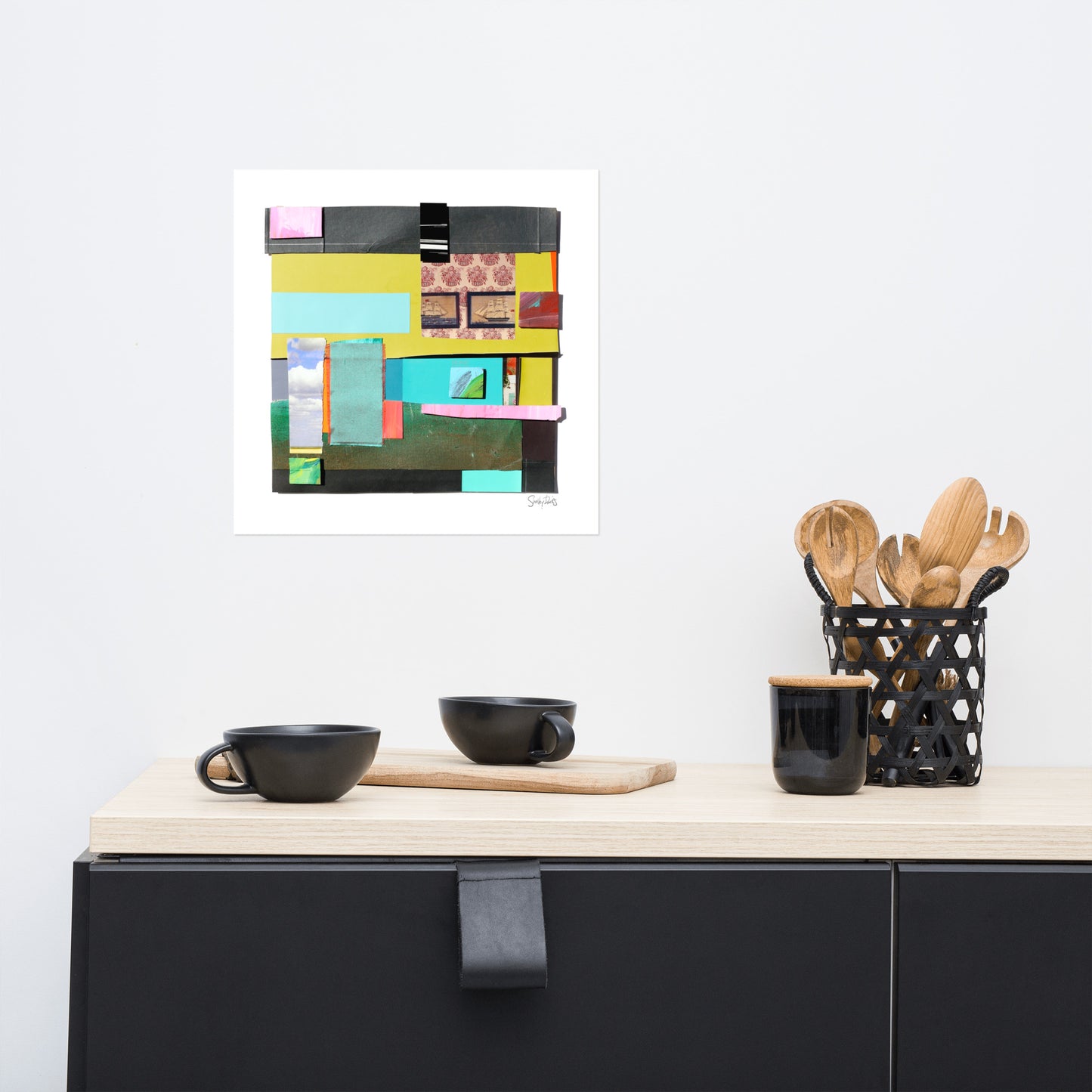 This mixed media collage is a 3-dimensional work, built up from paint chips, vintage hand-written letters, copies of textile fragments, scraps of brightly coloured paint palettes and black ink drawings. Shelley likes building up surfaces, starting with a cardboard structure, and then adding elements until they take on an architectural quality, giving the viewer a peek down a hidden corner of colour, a hallway of intrigue, typography, textiles and pattern to tell its story.