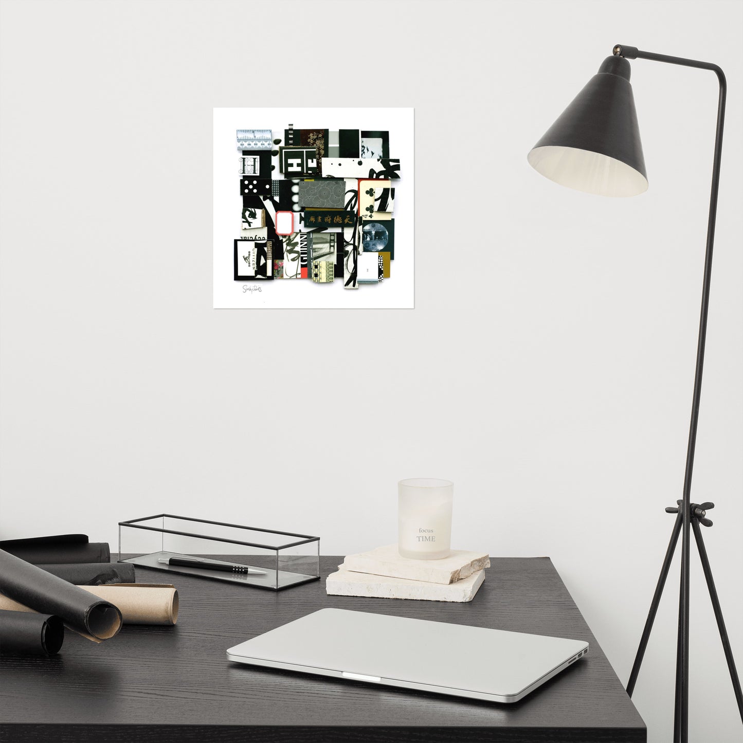 An image of the Golden Gate Bridge of San Francisco rising out of the fog is just one ingredient of this 3 D collage. With page numbers, hand-drawn ink calligraphy, a flock of geese, dominoes, a keyhole view of women at the opera, a playing card, a ruler, a Chinese sign, cherry blossoms, and black and white patterns all bringing this composition into focus.