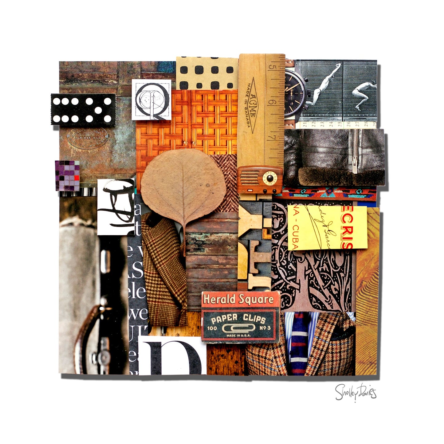 This 3D collage is filled to the brim with texture, pattern and interesting images. Menswear predominates here, with details of suits and ties, tweed textiles, a Gladstone bag, a man's watch, leather bomber jacket, carved door, vintage radio, cigar box typography, wooden type, arts and crafts typography, metal, wood, a few frames of Edweard Muybridge's figure studies circa 1880, and I'm sure a few more things if you look closely enough.