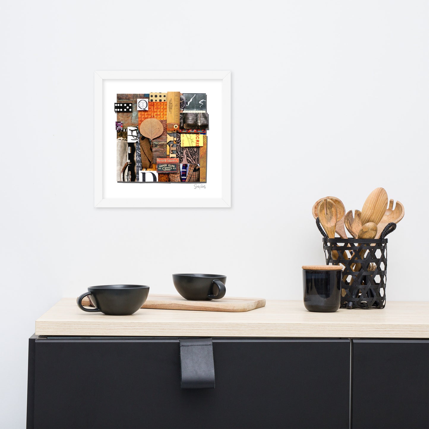 These are handmade, living pieces, many with overhanging elements from the collage assembly and the pieces are mounted in a slightly raised fashion (so as to appear floating) above a white, acid-free matte. We use Museum Glass, specially coated to make the viewing of the art completely glare and reflection-free (it looks like there is no glass; all you see is the artwork), as well as being 92% UV filtering (a very important feature, due to the use of fragile, paper ephemera).