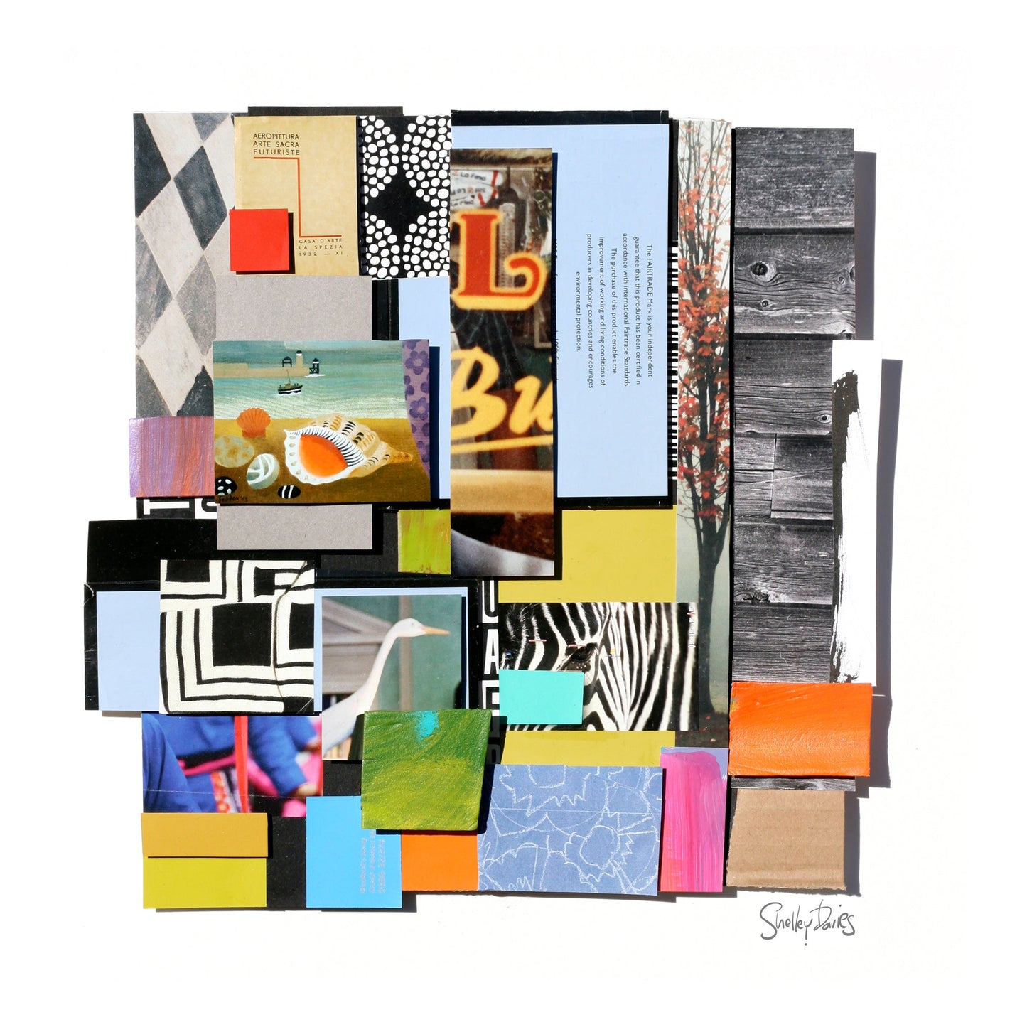 This mixed media collage is a 3-dimensional work, built up from paint chips, vintage hand-written letters, copies of textile fragments, scraps of brightly coloured paint palettes and black ink drawings. Shelley likes building up surfaces, starting with a cardboard structure, and then adding elements until they take on an architectural quality, giving the viewer a peek down a hidden corner of colour, a hallway of intrigue, typography, textiles and pattern to tell its story.