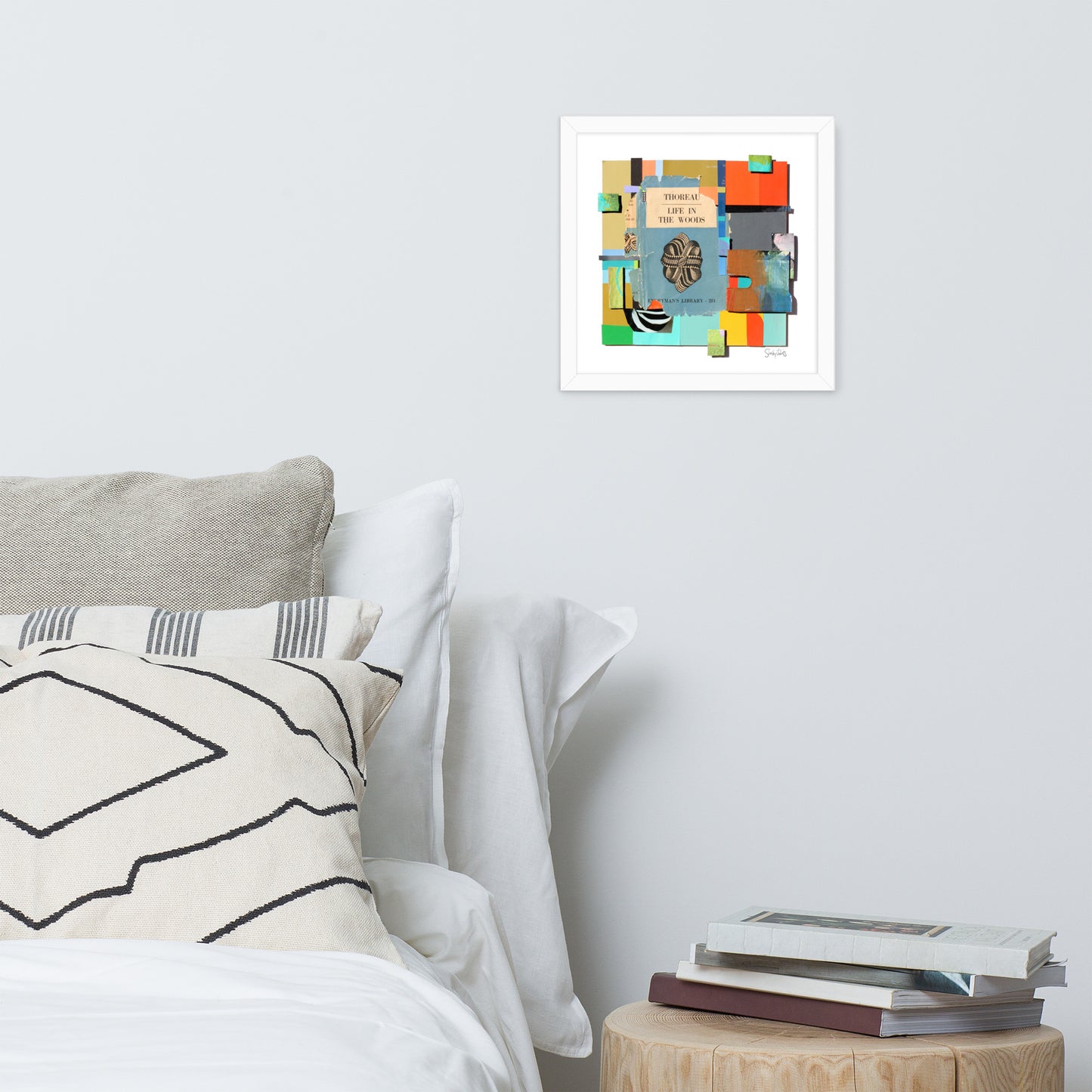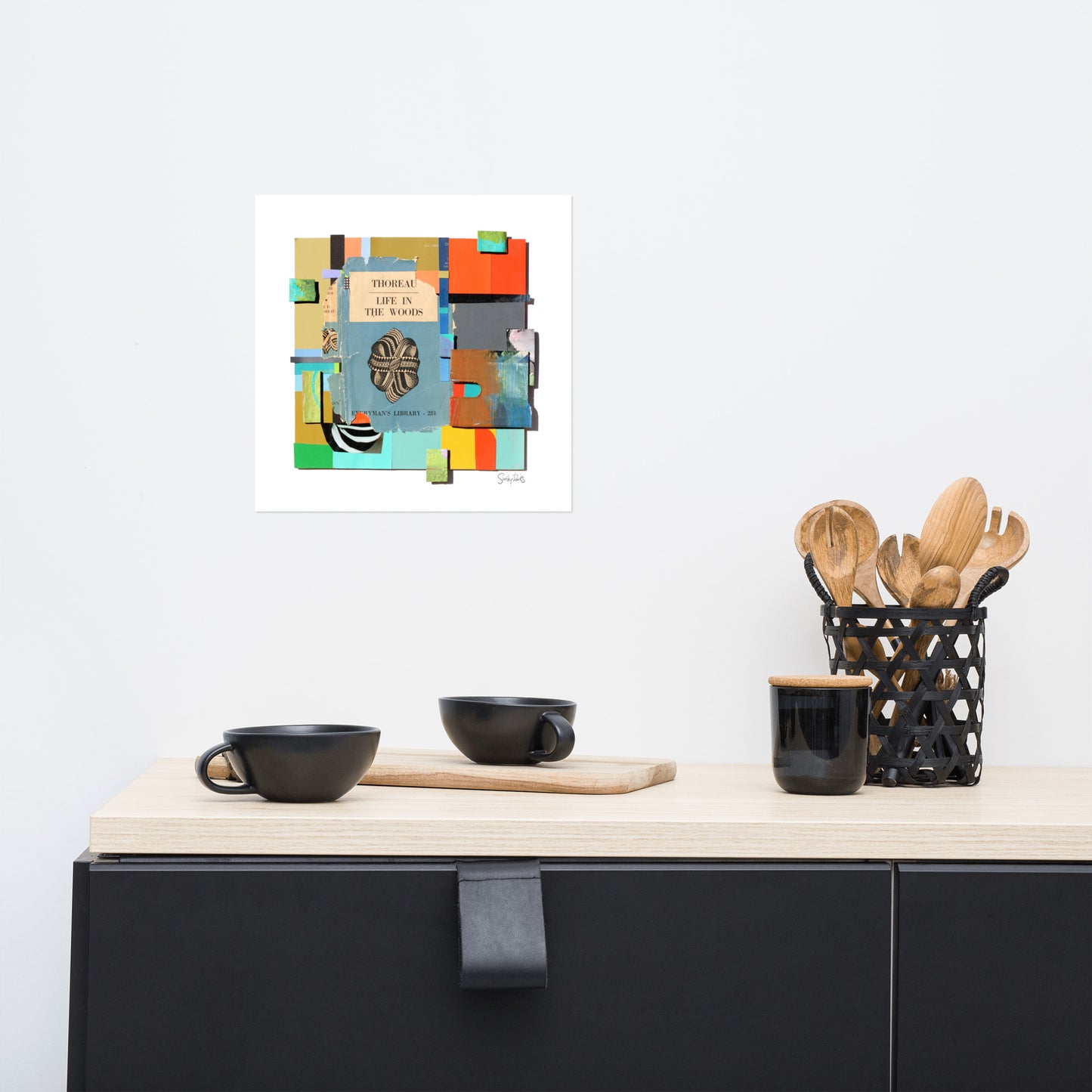"This 3D collage centres around a beautiful book cover designed by a favourite artist of mine, Eric Ravilious (1903-1942), English painter, designer, illustrator extraordinaire. The colours in this composition are placed around the book cover, dancing in harmony with the swirls of the black and white loops of Ravilious' design. The title of the work has been borrowed from the writer of the book, 'Life In The Woods' by Henry Thoreau."