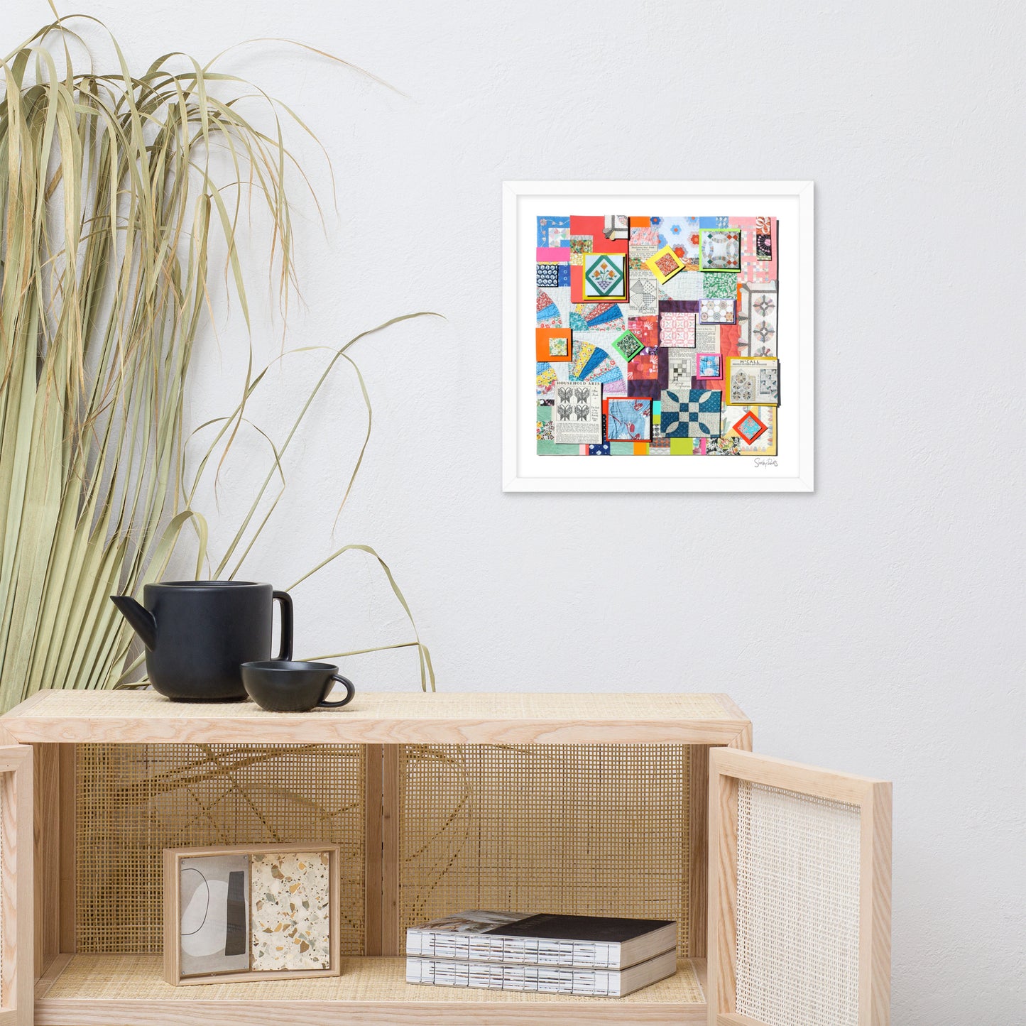 This mixed media collage is a 3-dimensional work, built up from paint chips, vintage hand-written letters, copies of textile fragments, scraps of brightly coloured paint palettes and black ink drawings. Shelley likes building up surfaces, starting with a cardboard structure, and then adding elements until they take on an architectural quality, giving the viewer a peek down a hidden corner of colour, a hallway of intrigue, typography, textiles and pattern to tell its story.
