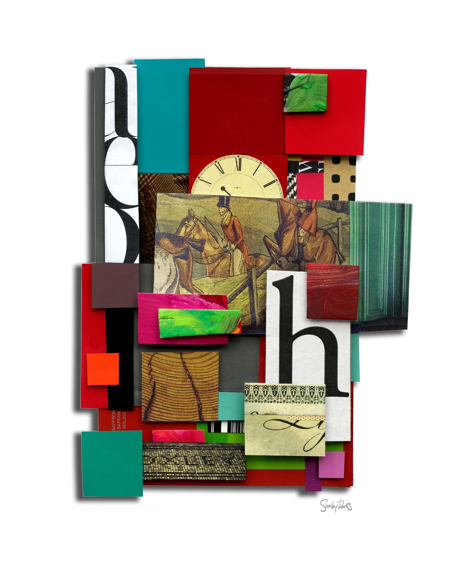 This 3D collage has incorporated the colours of an Edwardian drawing room, complete with hunting scene and ticking clock. Copperplate script and 'Oxley' spelt out in mosaic tiles on a doorstep evoke the past, while the multi-levelled composition, with its glimpses of typographic detail and paint splodges give it a contemporary twist.