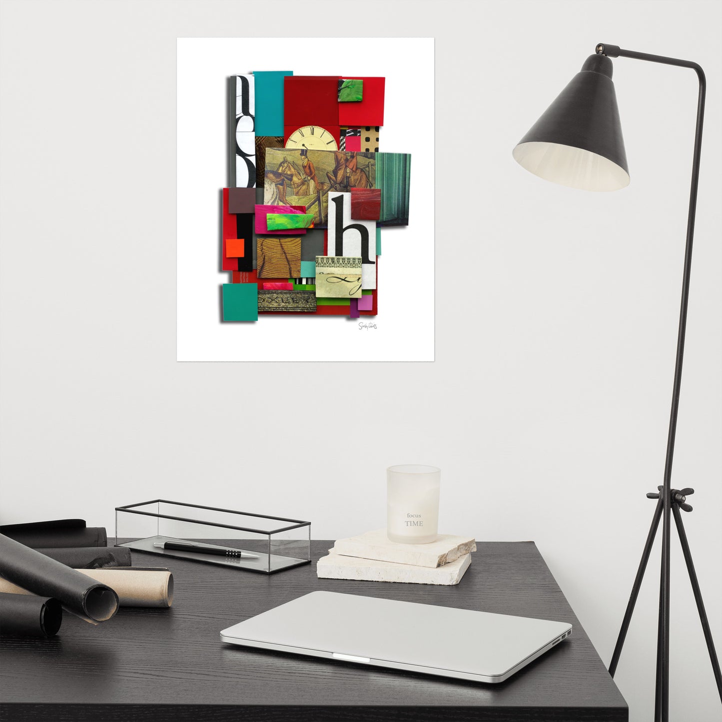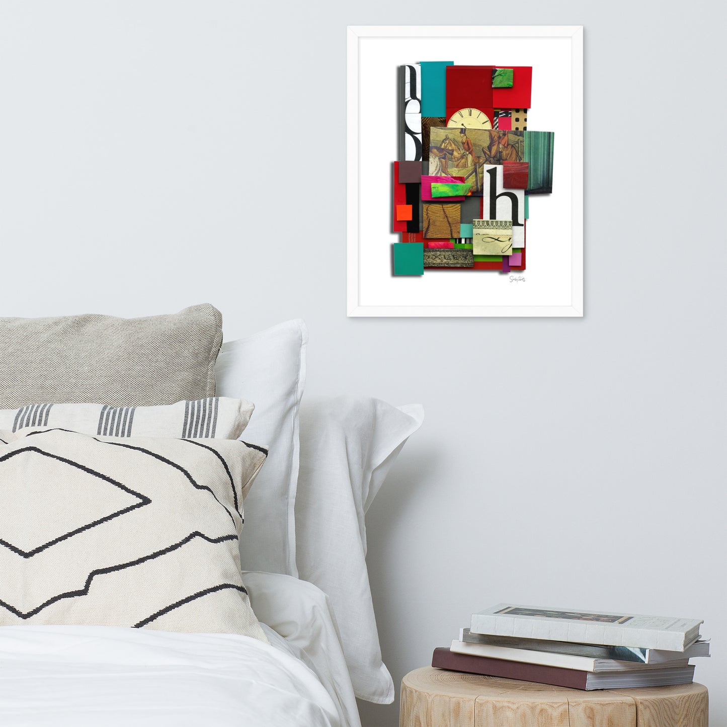 These are handmade, living pieces, many with overhanging elements from the collage assembly and the pieces are mounted in a slightly raised fashion (so as to appear floating) above a white, acid-free matte. We use Museum Glass, specially coated to make the viewing of the art completely glare and reflection-free (it looks like there is no glass; all you see is the artwork), as well as being 92% UV filtering (a very important feature, due to the use of fragile, paper ephemera).