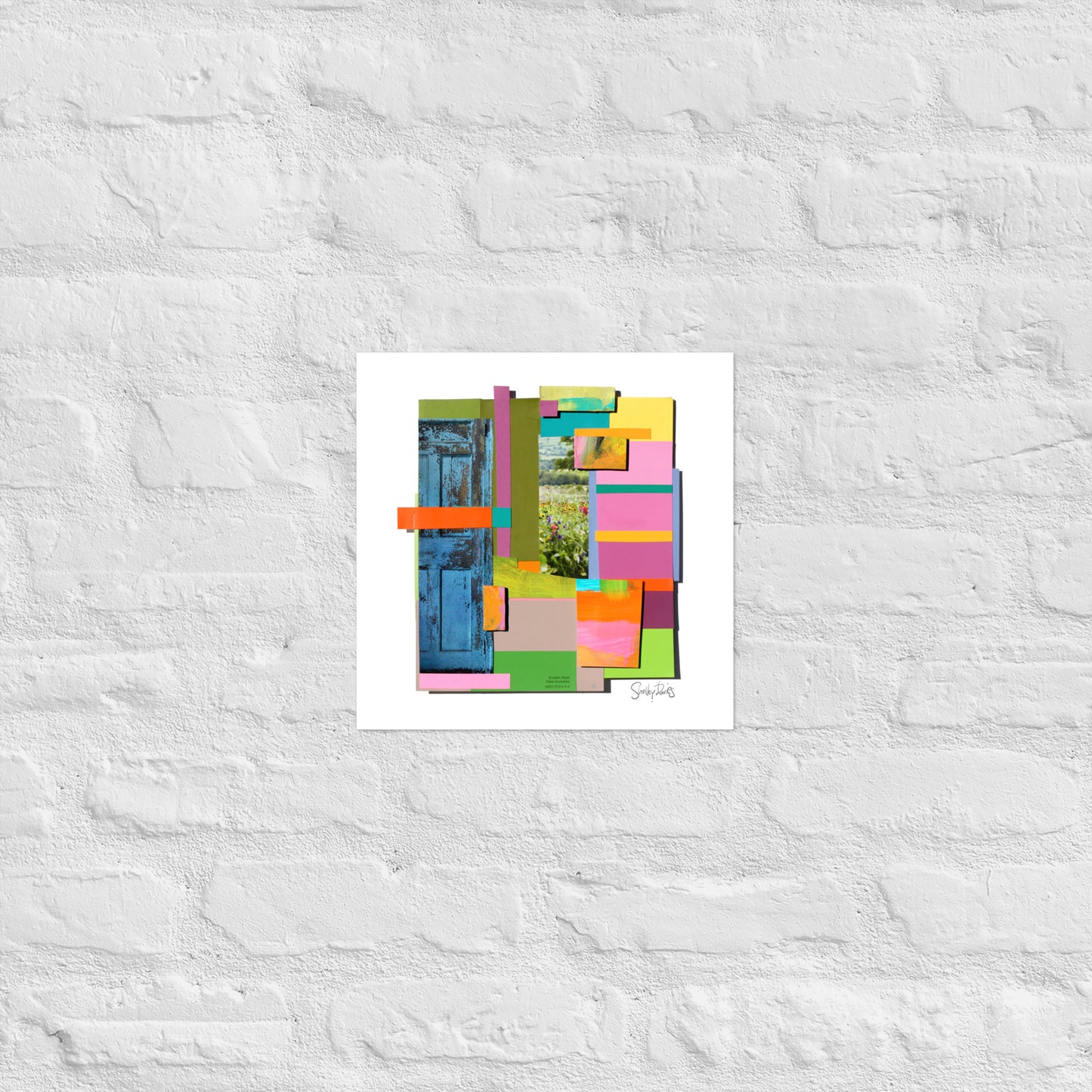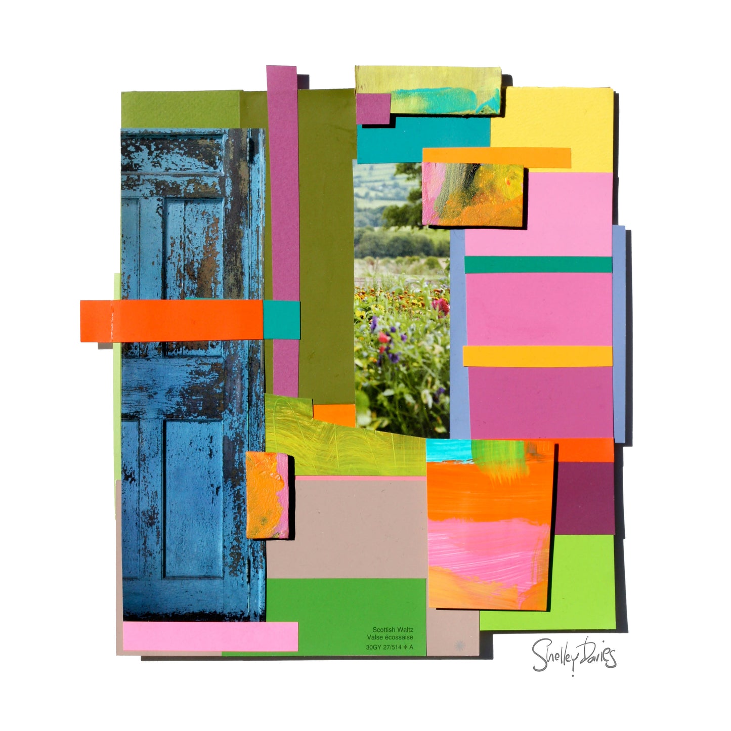 This mixed media collage is a 3-dimensional work, built up from paint chips, vintage hand-written letters, copies of textile fragments, scraps of brightly coloured paint palettes and black ink drawings. Shelley likes building up surfaces, starting with a cardboard structure, and then adding elements until they take on an architectural quality, giving the viewer a peek down a hidden corner of colour, a hallway of intrigue, typography, textiles and pattern to tell its story.
