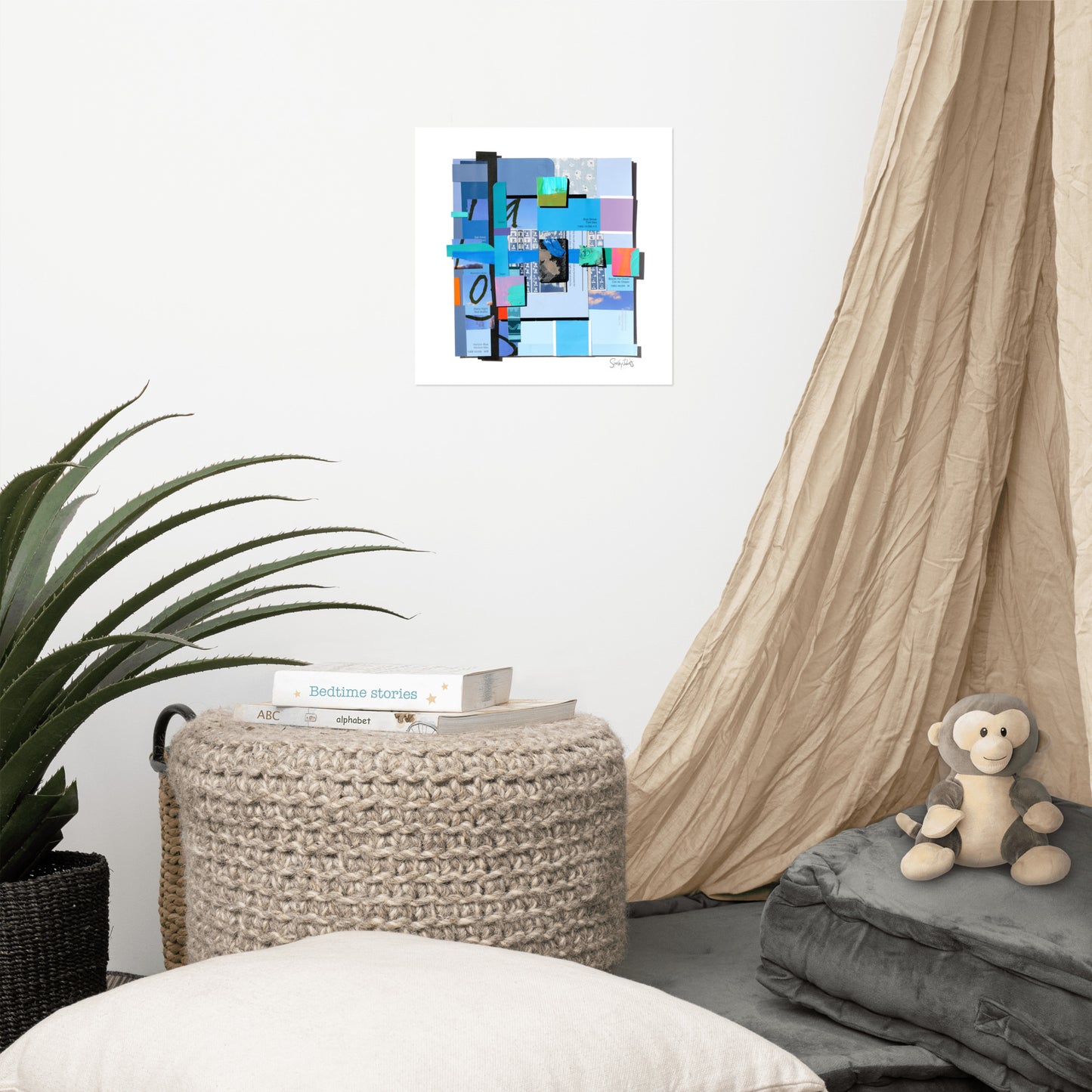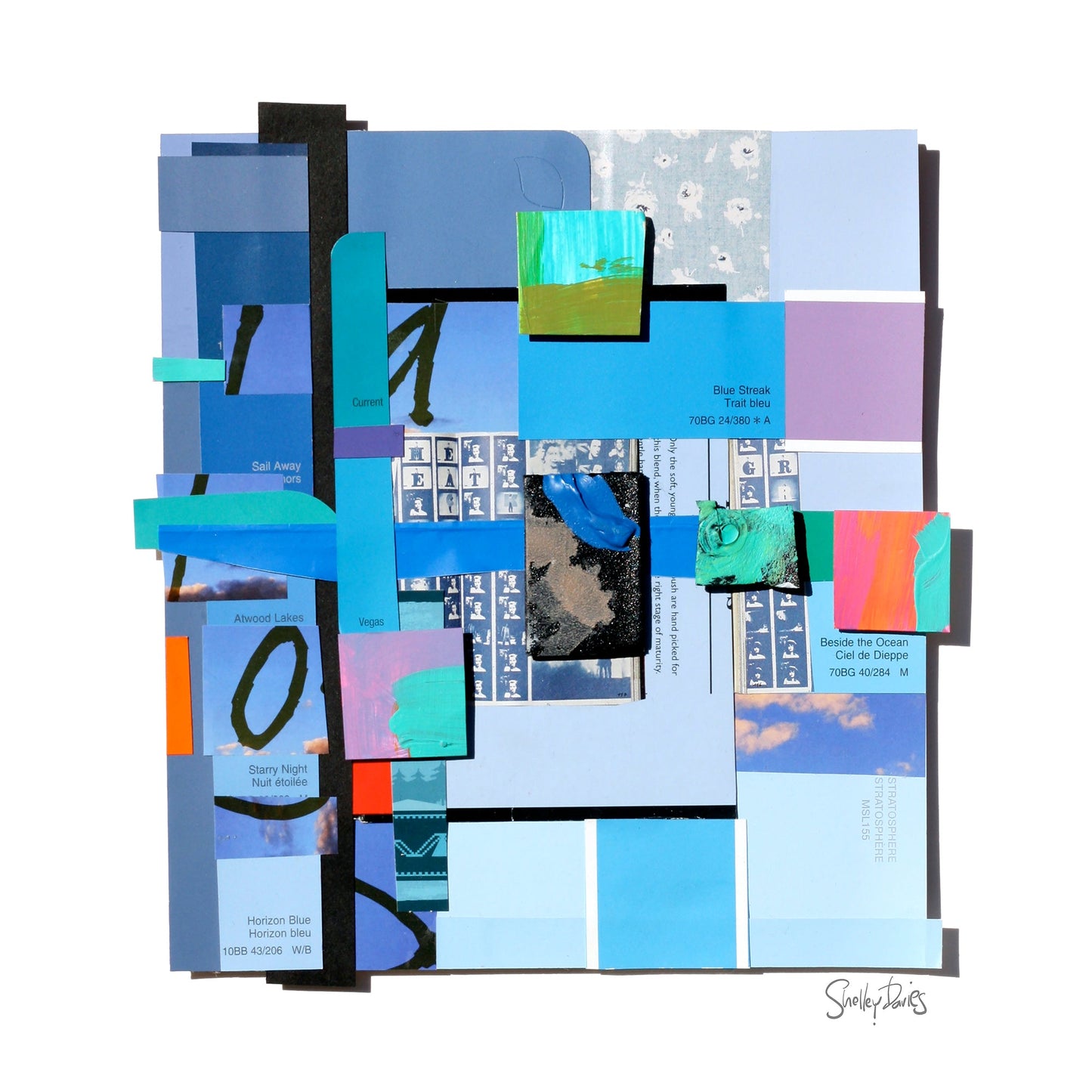 This 3D collage is a composition of blues: bits of sky, paint chips in various shades of blue, patterns, colourful bits of my paint palettes and details of typography. The title comes from one of the paint chip colours named 'Stratosphere'.
