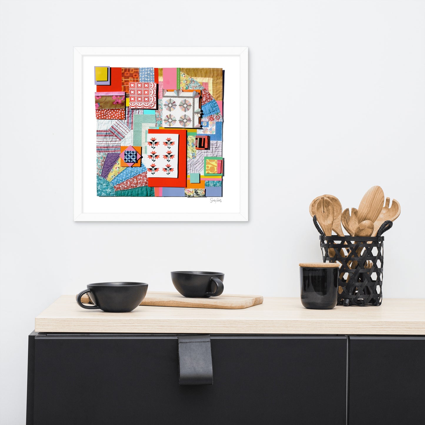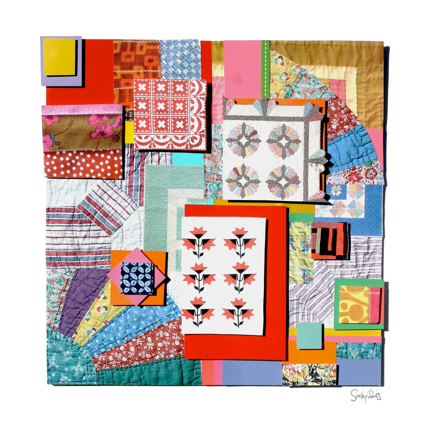 A fantastic collection of quilts, textiles and patterns, this 3D collage embraces quilting and its traditions. I took photographs of my mother-in-law's quilts (round pin-wheel design), made by her mother from childhood dresses (in the days of 'waste not, want not') A beloved and ancient quilt of my sister's shows up here, too (the bow tie design). The title of this piece takes its name from the red, black and white quilt in the centre, which is a traditional quilt design called 'Turkey Foot', as the motif is shaped like a turkey's footprint.