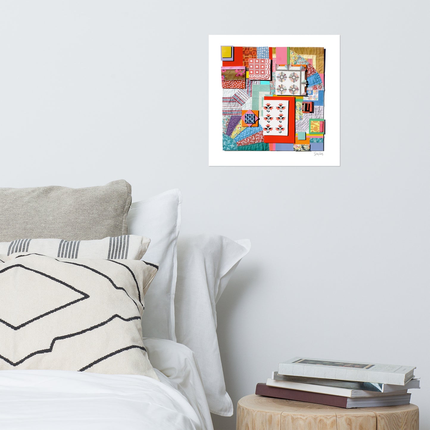 This mixed media collage is a 3-dimensional work, built up from paint chips, vintage hand-written letters, copies of textile fragments, scraps of brightly coloured paint palettes and black ink drawings. Shelley likes building up surfaces, starting with a cardboard structure, and then adding elements until they take on an architectural quality, giving the viewer a peek down a hidden corner of colour, a hallway of intrigue, typography, textiles and pattern to tell its story.