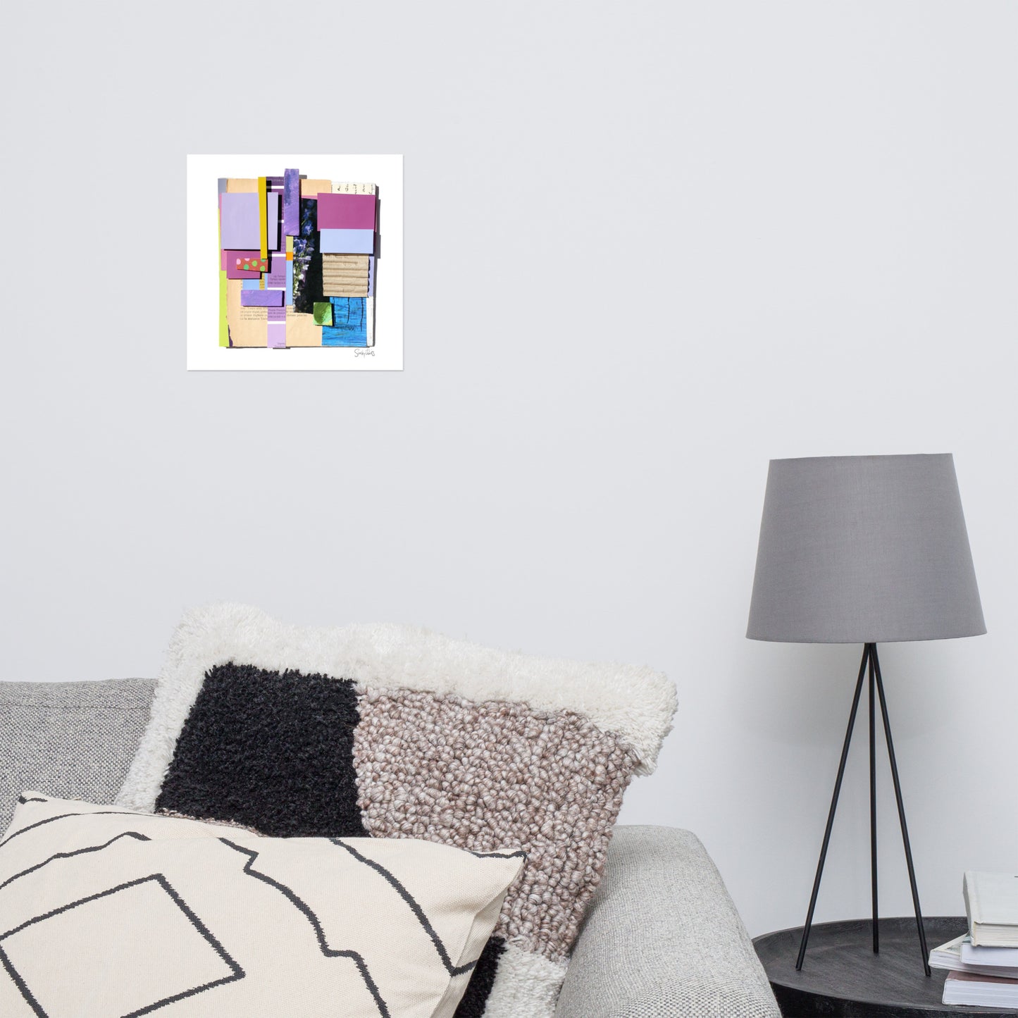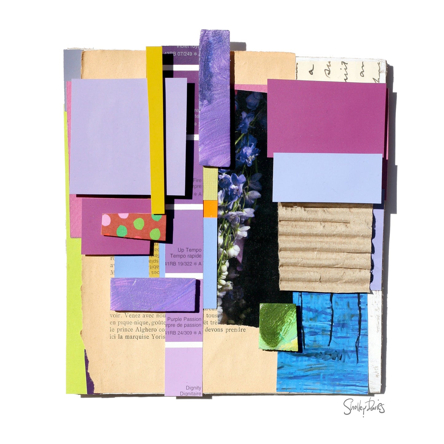 This mixed media collage is a 3-dimensional work, built up from paint chips, vintage hand-written letters, copies of textile fragments, scraps of brightly coloured paint palettes and black ink drawings. Shelley likes building up surfaces, starting with a cardboard structure, and then adding elements until they take on an architectural quality, giving the viewer a peek down a hidden corner of colour, a hallway of intrigue, typography, textiles and pattern to tell its story.