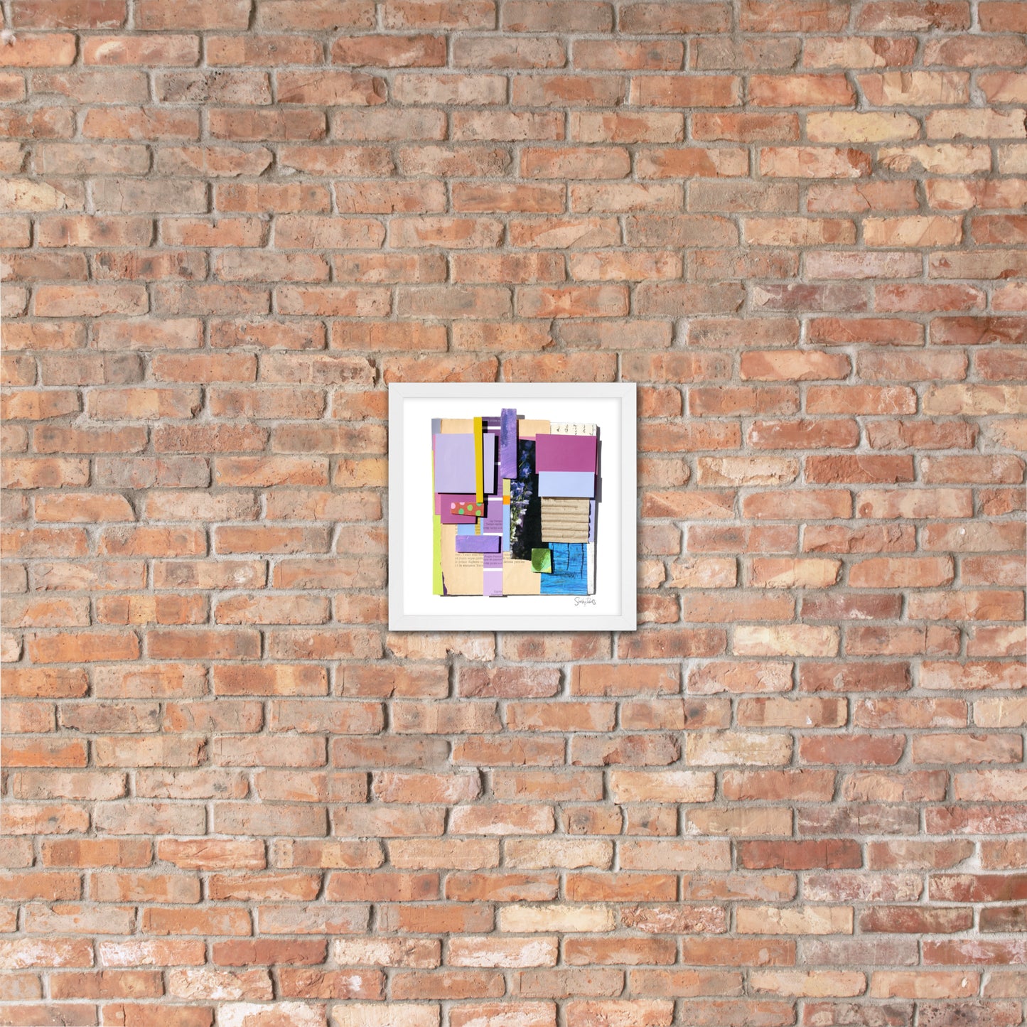 These are handmade, living pieces, many with overhanging elements from the collage assembly and the pieces are mounted in a slightly raised fashion (so as to appear floating) above a white, acid-free matte. We use Museum Glass, specially coated to make the viewing of the art completely glare and reflection-free (it looks like there is no glass; all you see is the artwork), as well as being 92% UV filtering (a very important feature, due to the use of fragile, paper ephemera).