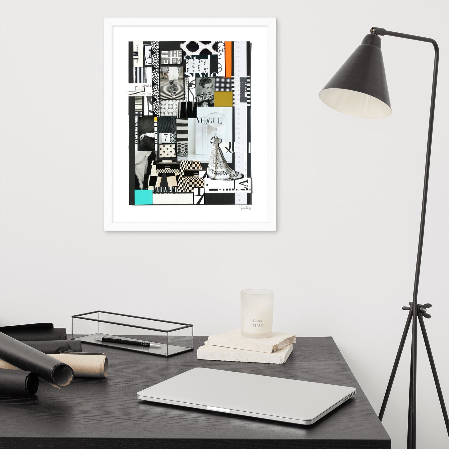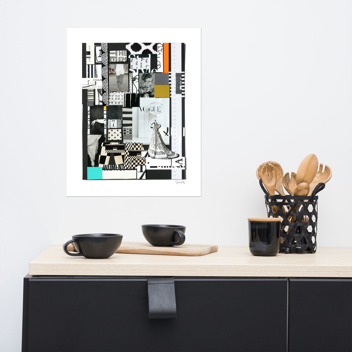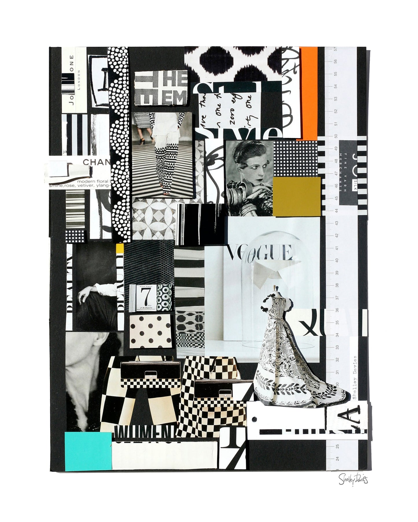 Women, beauty and fashion are the focal point for this charming composition. Black and white pattern abounds in this busy 3D collage, with 1960's Mod handbags keeping pace with the 1925 Man Ray image of Nancy Cunard looking madcap with her bracelets. Echoes of fragrances (the title 'Vetiver' being both a signature scent name and an intriguing ingredient in the perfume industry), an elegant hand, the curve of a neck, a paper ball gown and a starched collar under a bell glass highlight the many facets of what we deem beautiful.