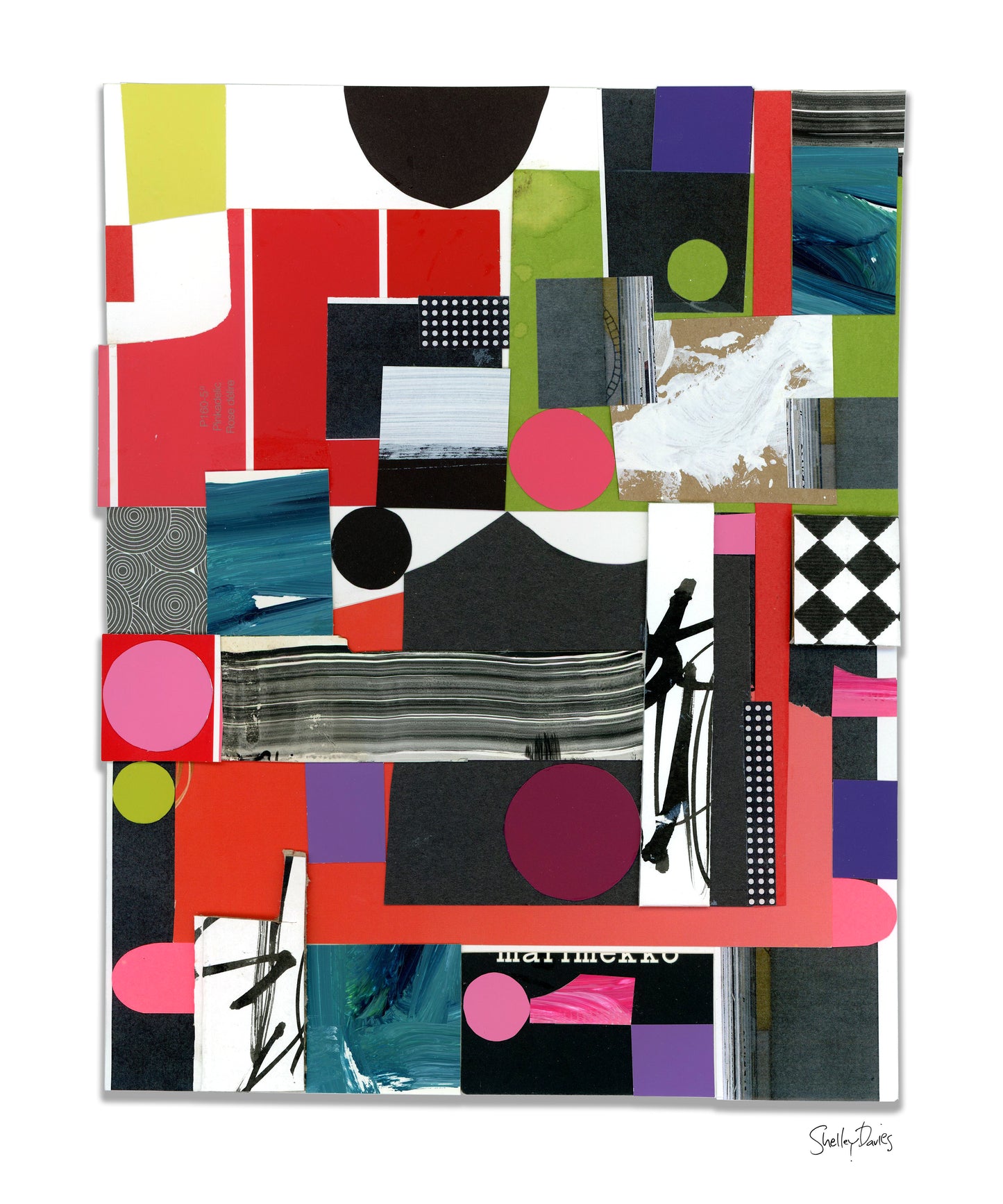 This piece features a play on pink, which not only is one of my favourite hues but also seems to be the colour of the year! Cut-up paint chips, pieces of photography, bits of typography, and bright, bold shapes and colours combine to create a vibrant, visual rhythm.