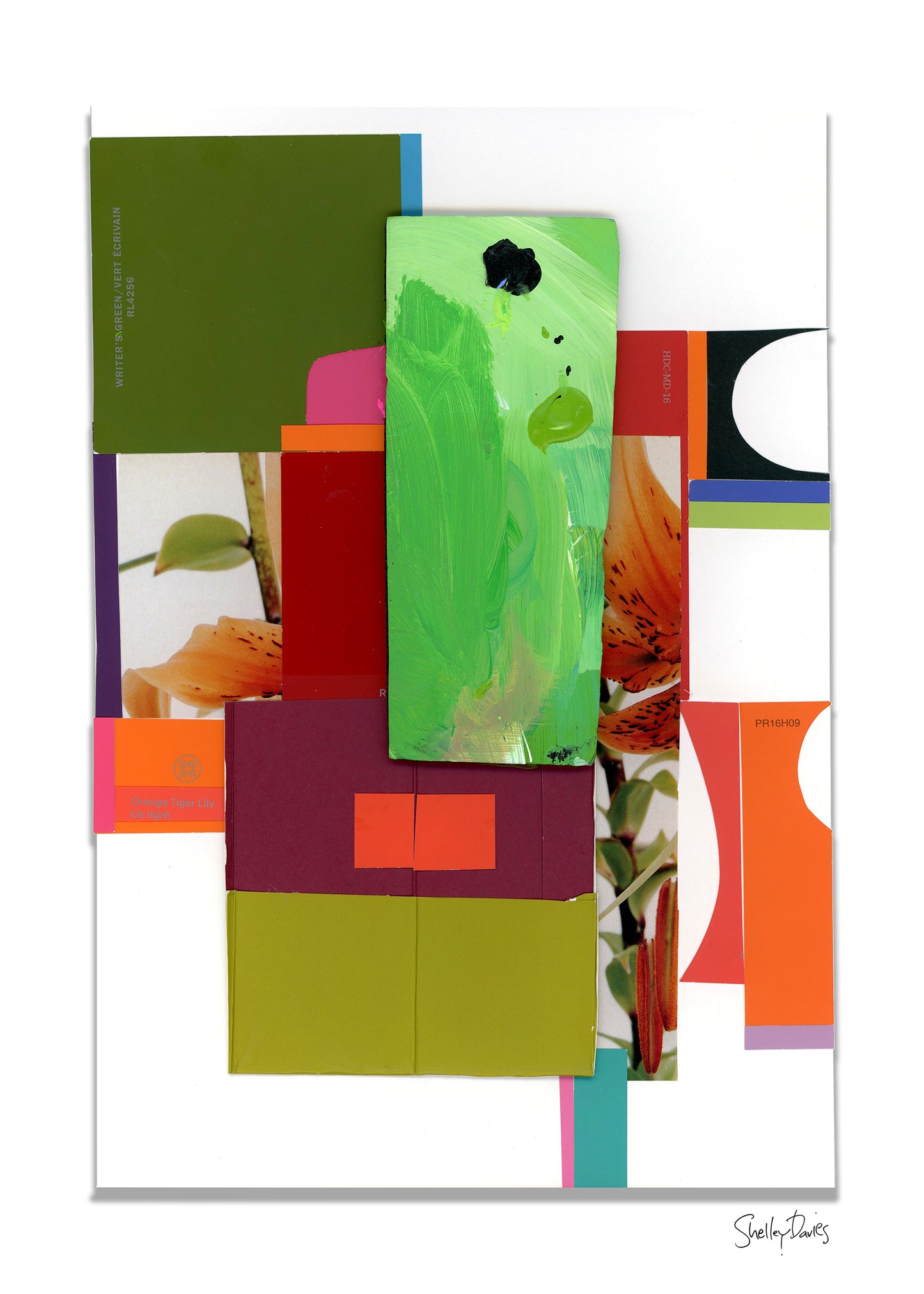 A deconstructed photograph of a tiger lily, some paint chips (one of which lent its name to this piece) and a paint palette came together here to create a vibrant composition with bold shapes and a happy visual rhythm.