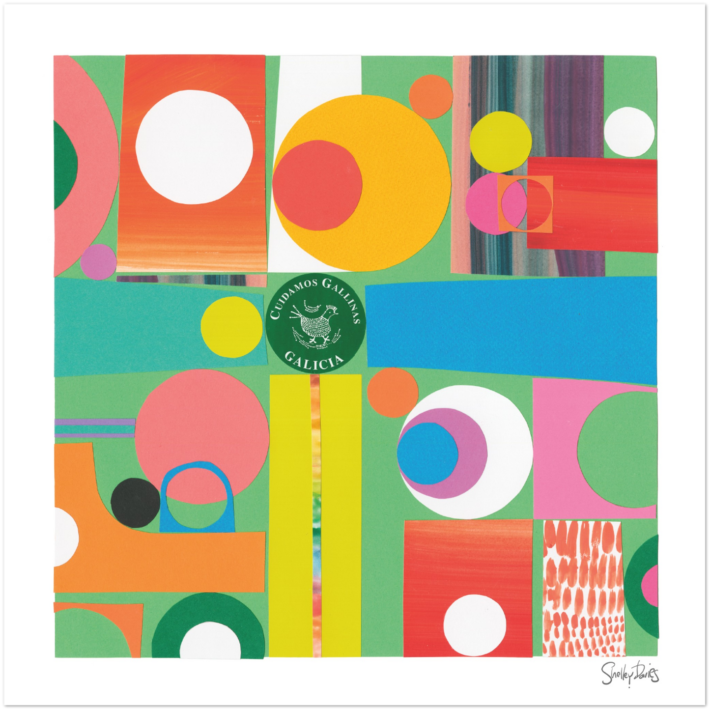 A small elegant sticker found on some wonderful Spanish egg packaging from Galicia was the starting point for this handmade paper collage. With circles and chopped up watercolours, a vibrant rhythm completes this colourful composition.
