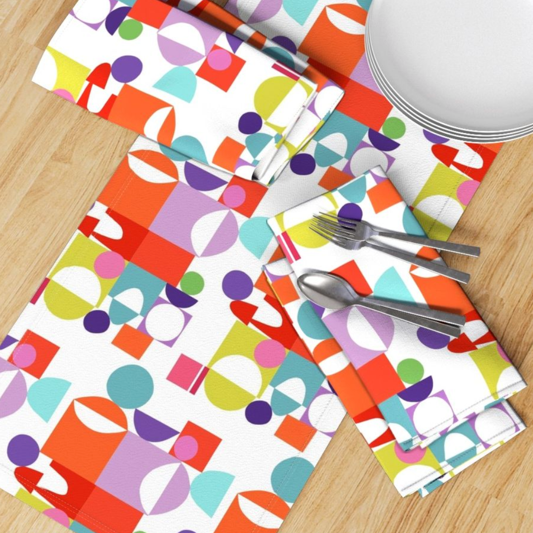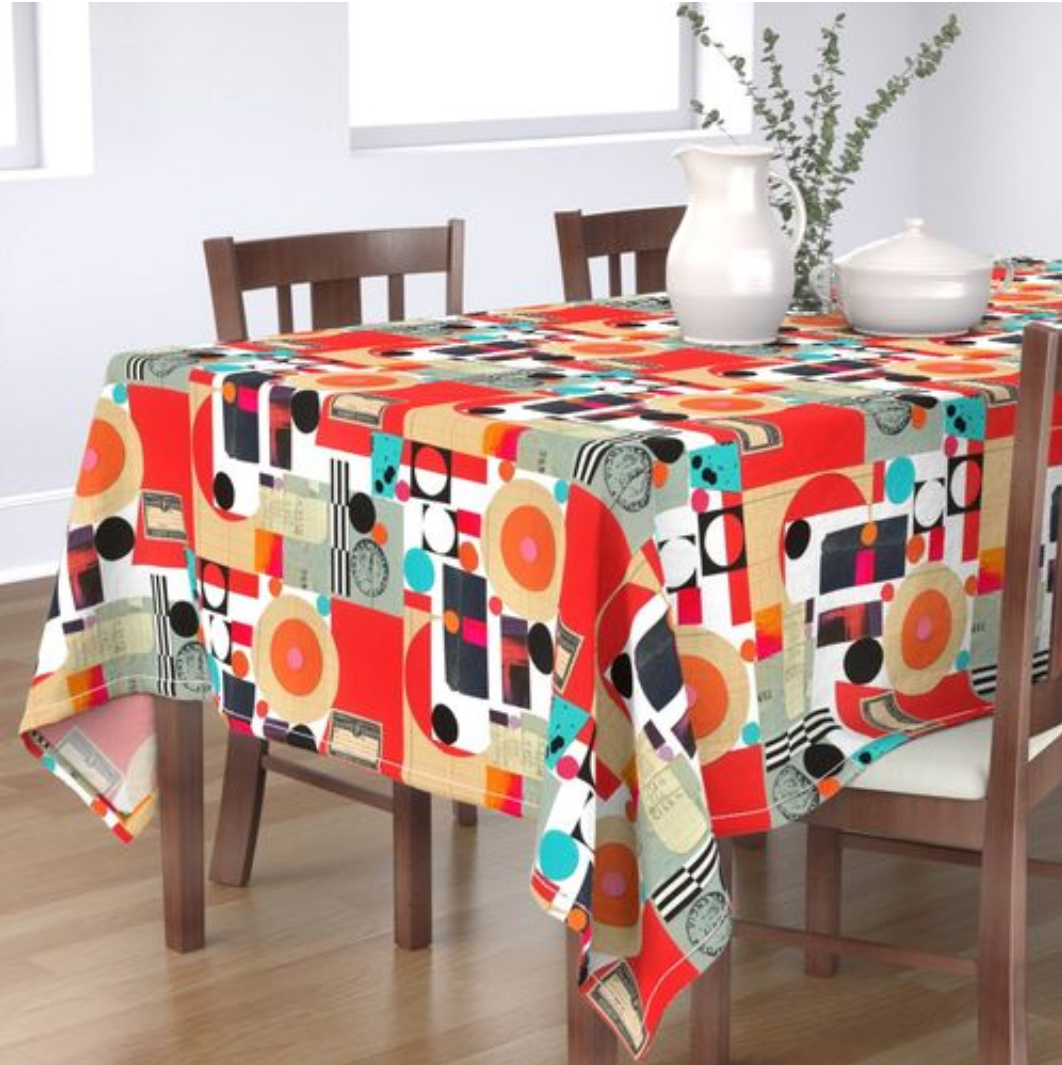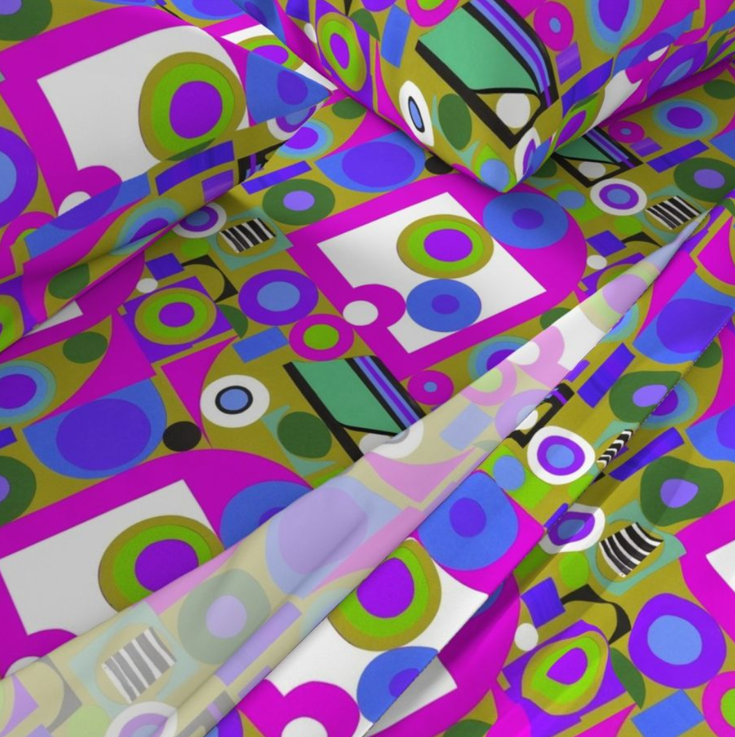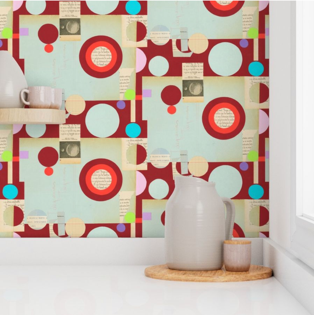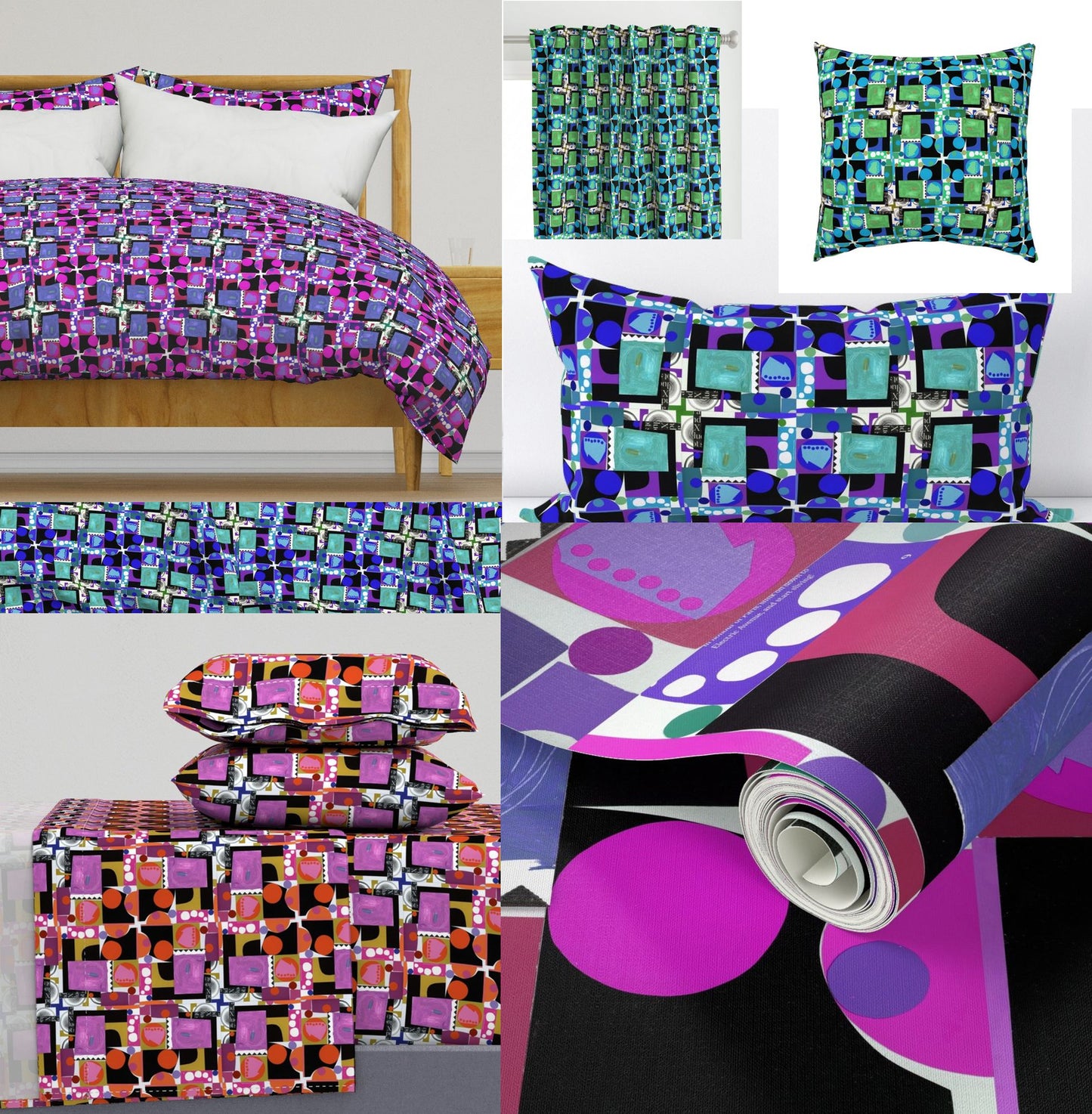 This wonderful collage makes for spectacular fabric, with a few minor additions, including a complementary fabric pattern created from the wonderful geometric shapes found on the original artwork.