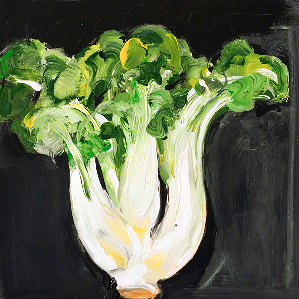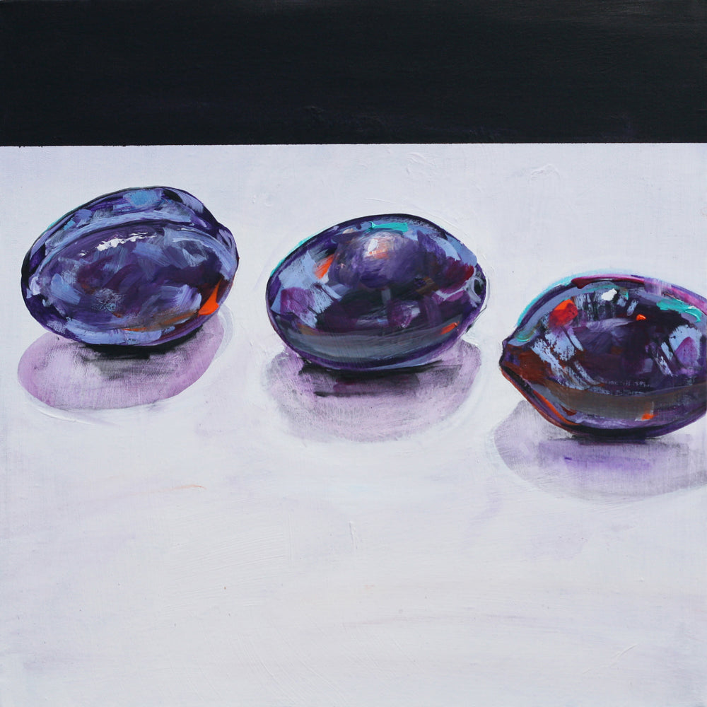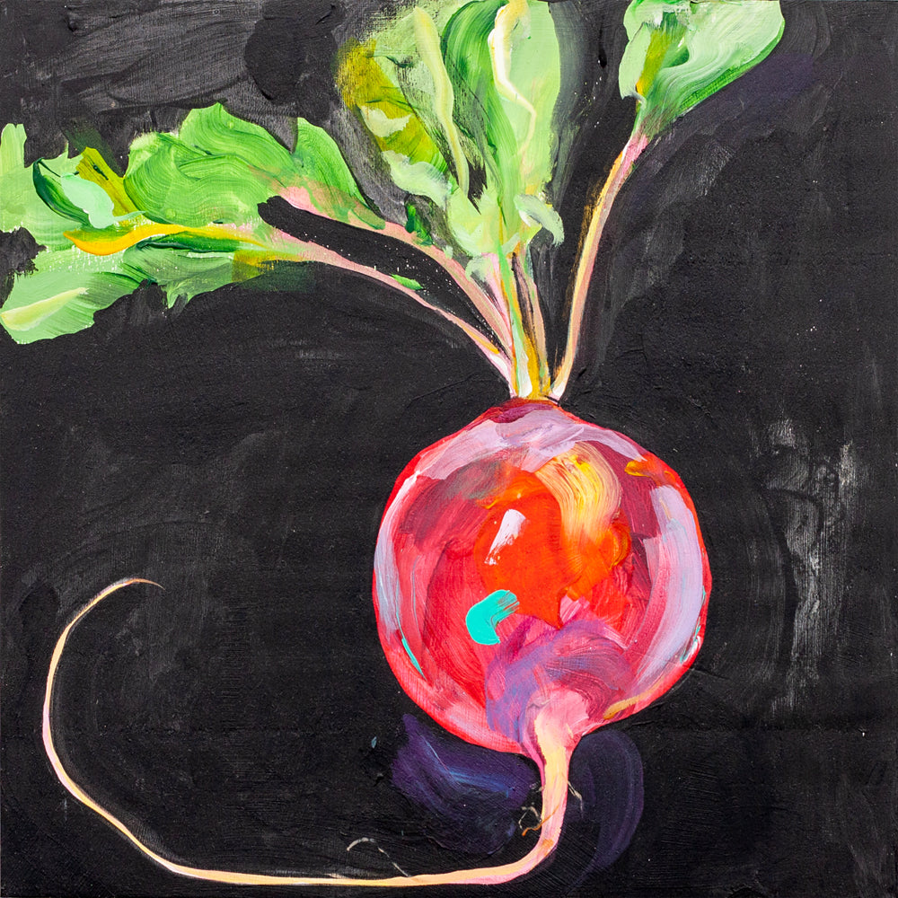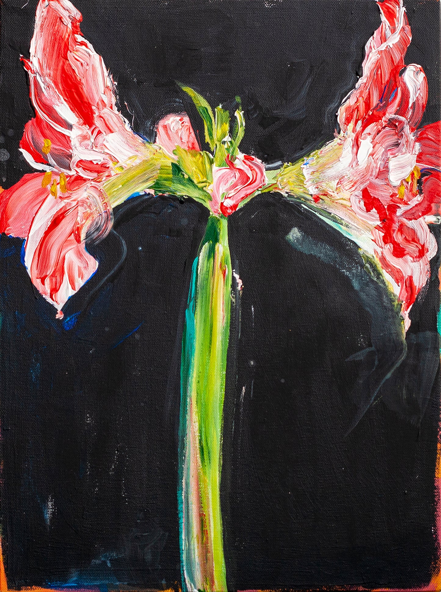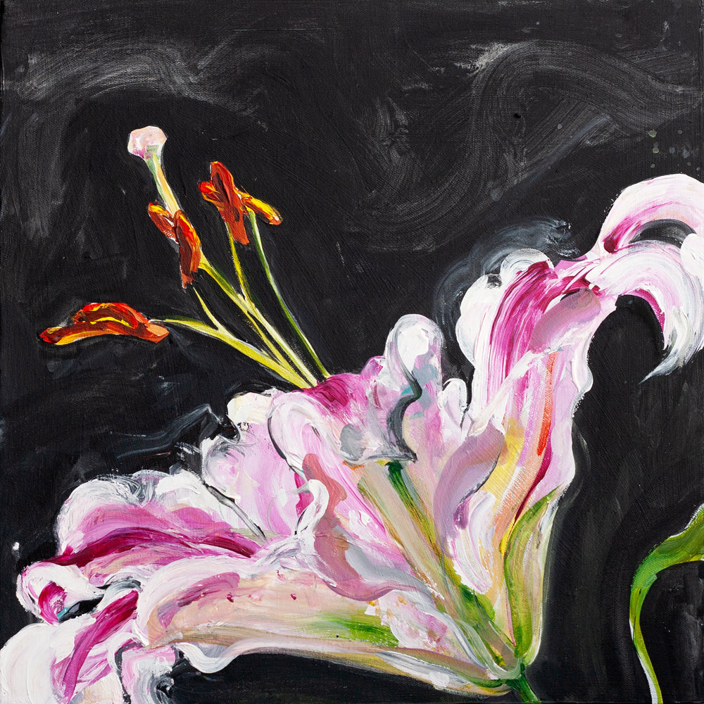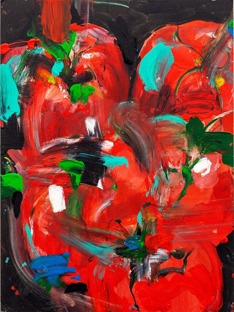 Her fascination with the visible yet rarely seen colours in nature continues with bold interpretations of still life. These bright acrylics are sometimes juxtaposed against dark surfaces, making the contrast even more stark.