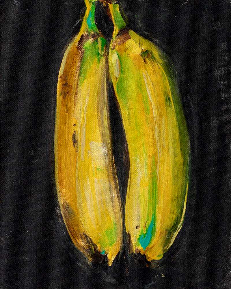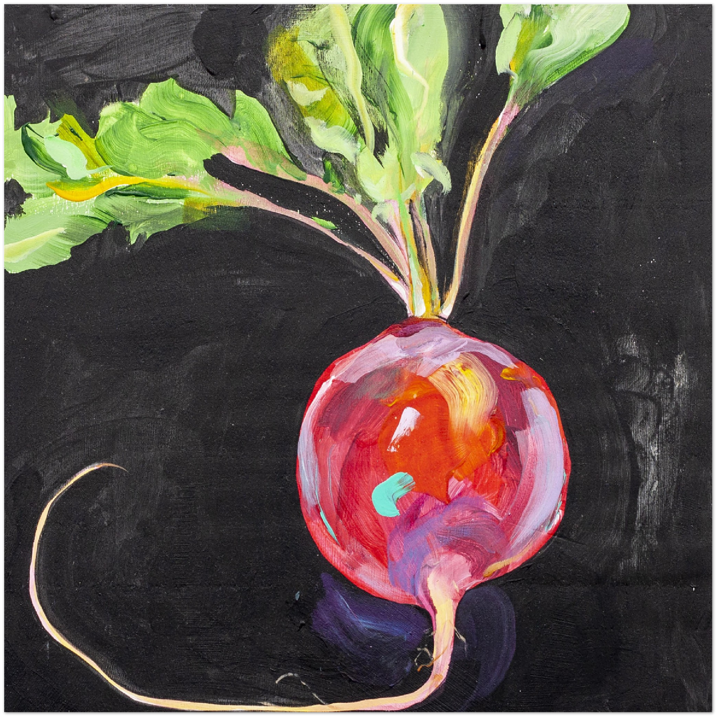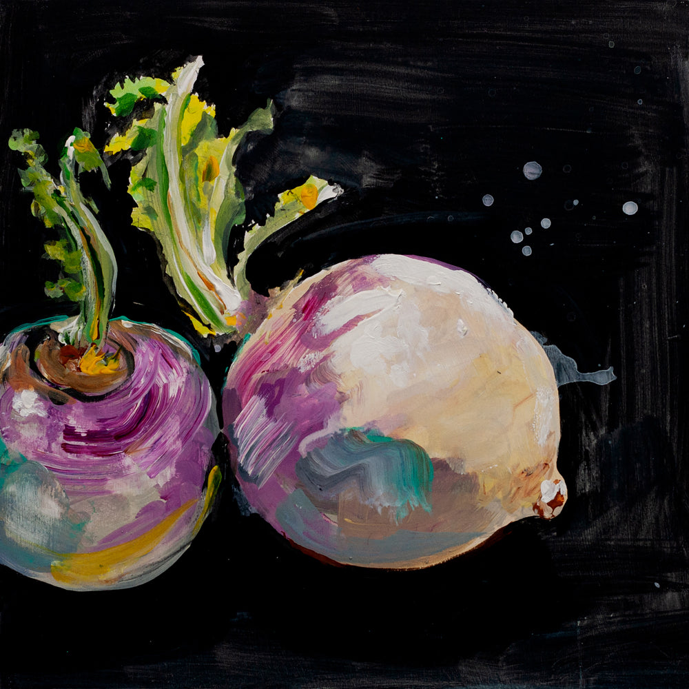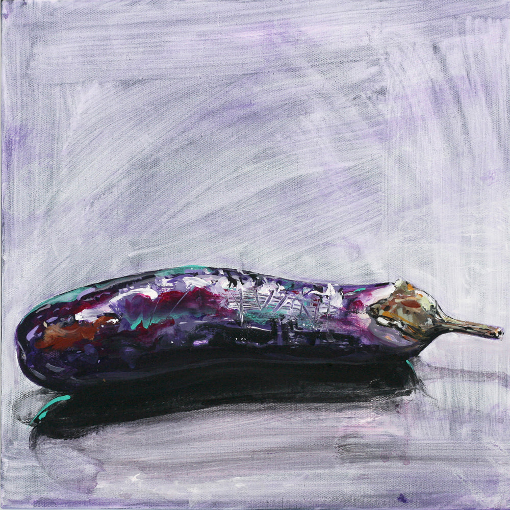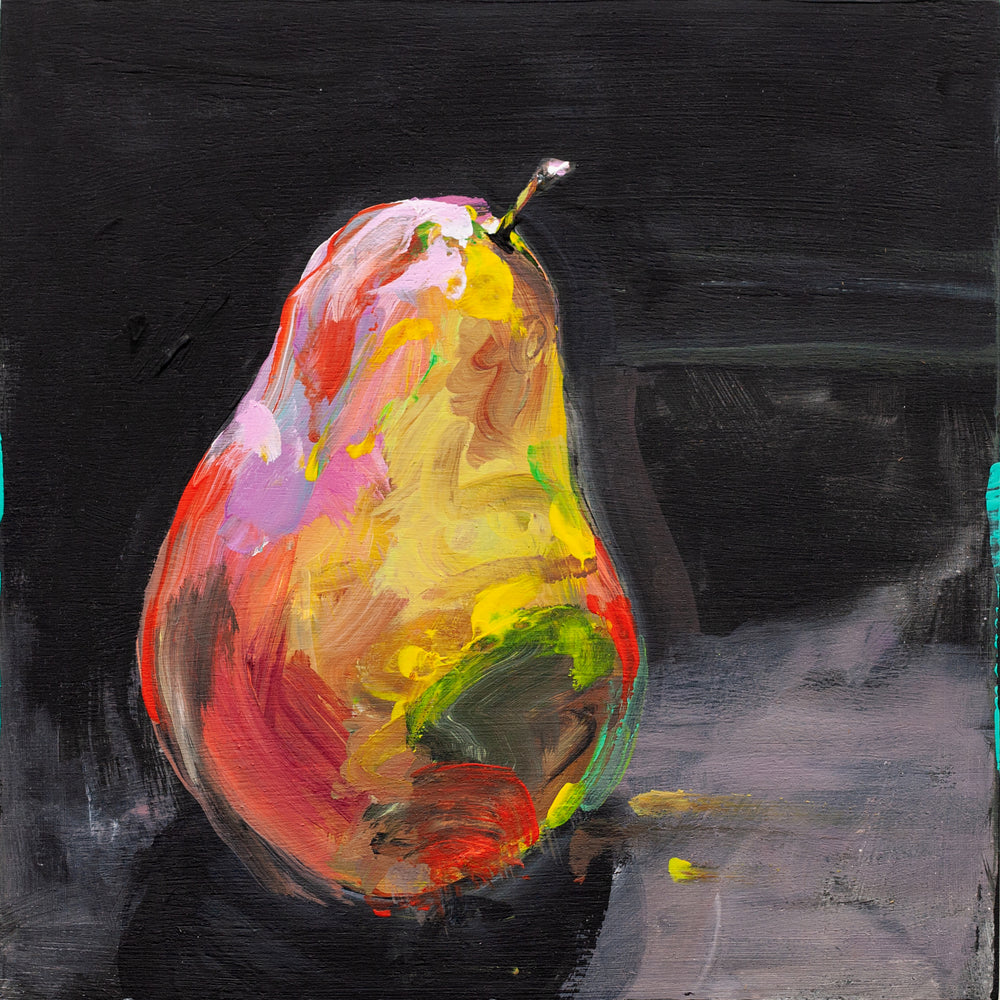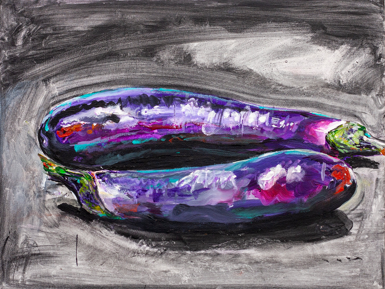 Her fascination with the visible yet rarely seen colours in nature continues with bold interpretations of still life. These bright acrylics are sometimes juxtaposed against dark surfaces, making the contrast even more stark.