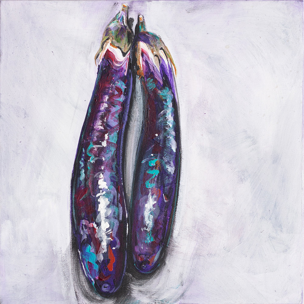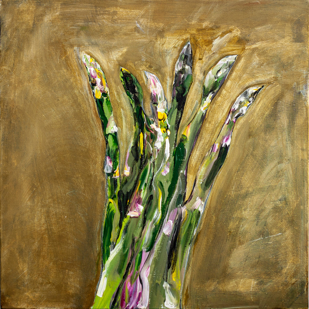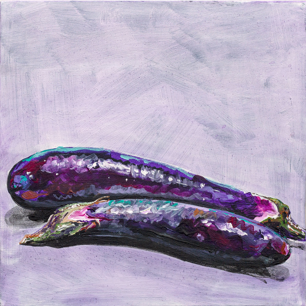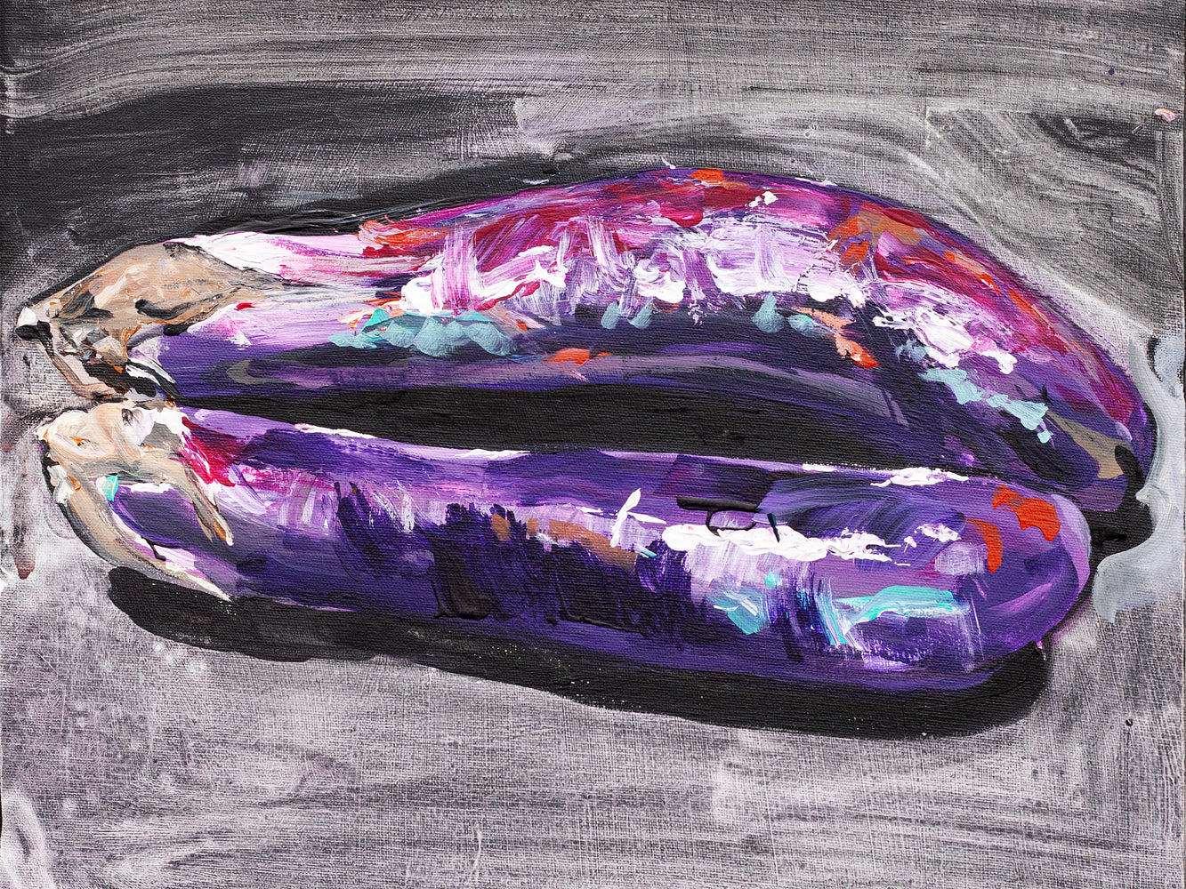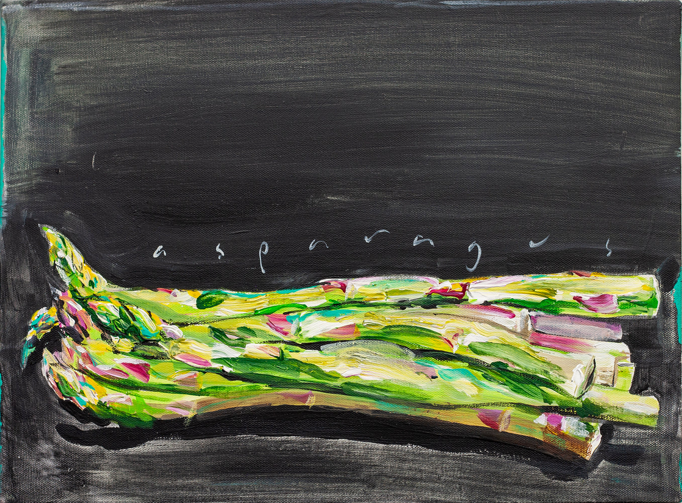 Her fascination with the visible yet rarely seen colours in nature continues with bold interpretations of still life. These bright acrylics are sometimes juxtaposed against dark surfaces, making the contrast even more stark.