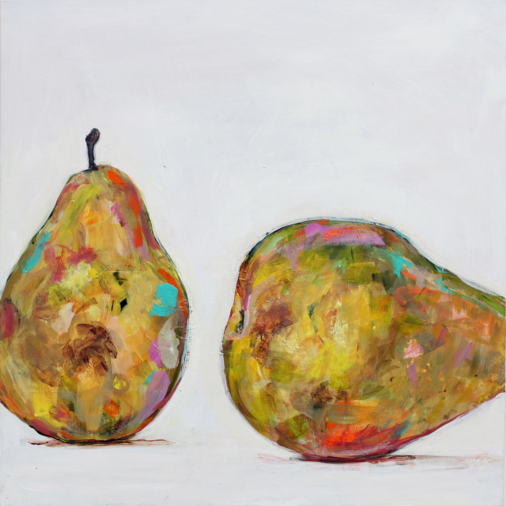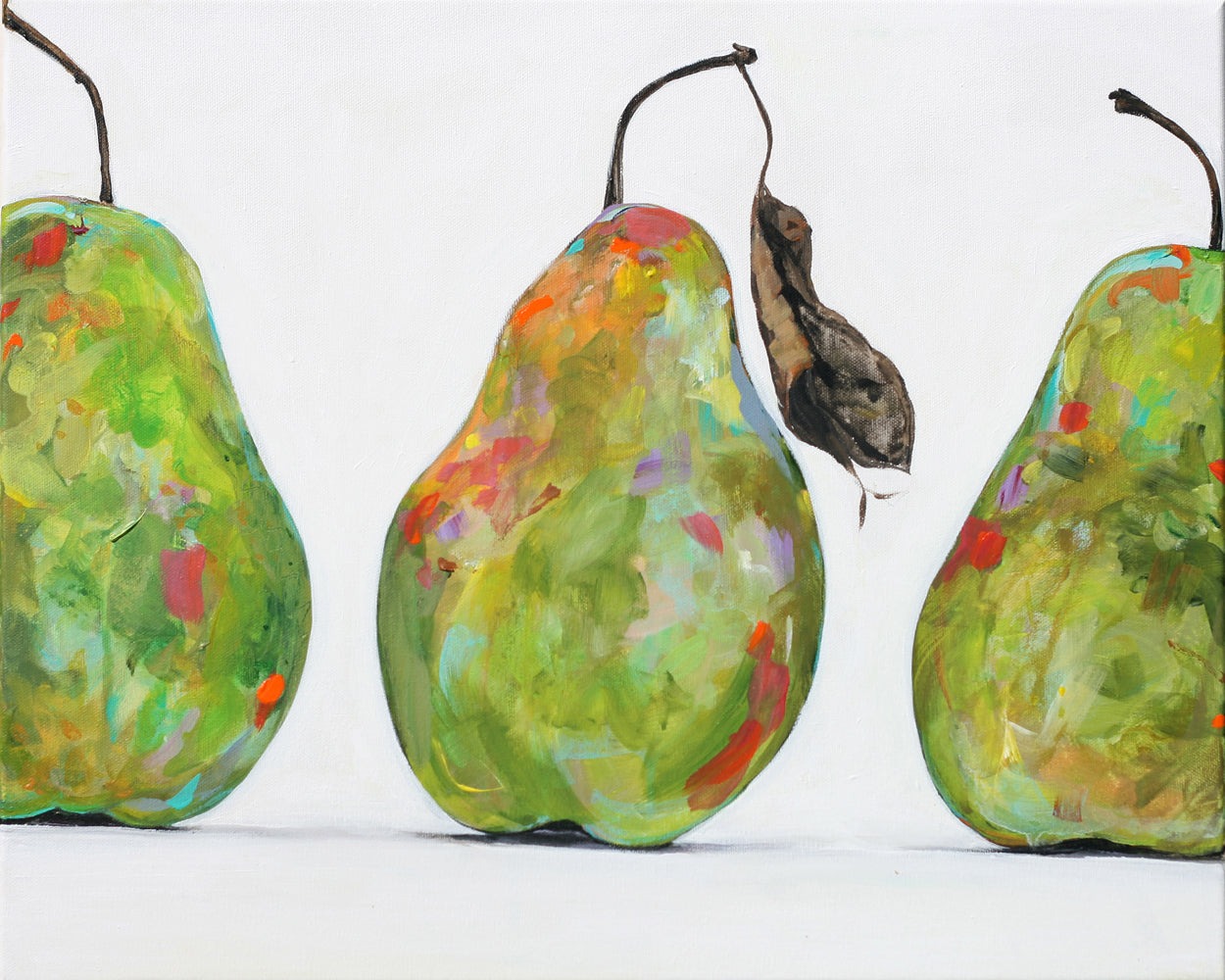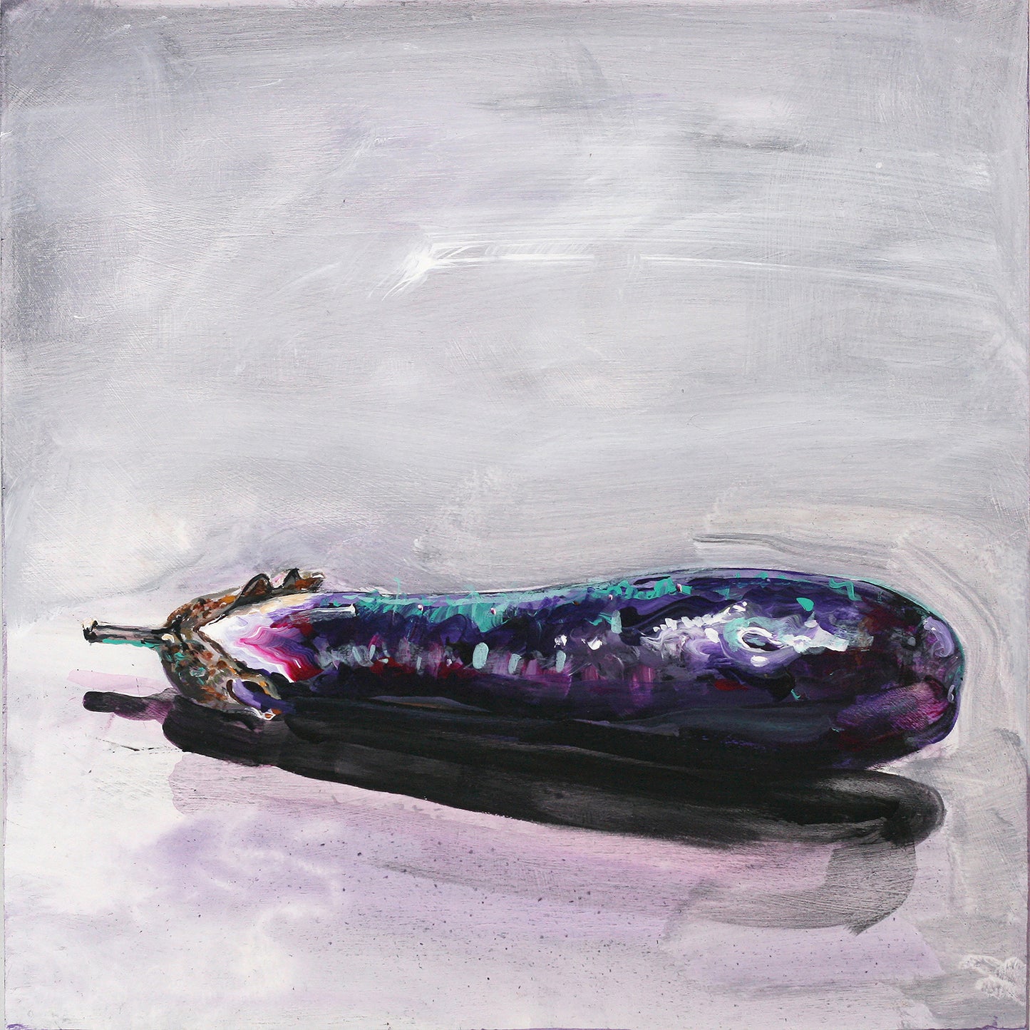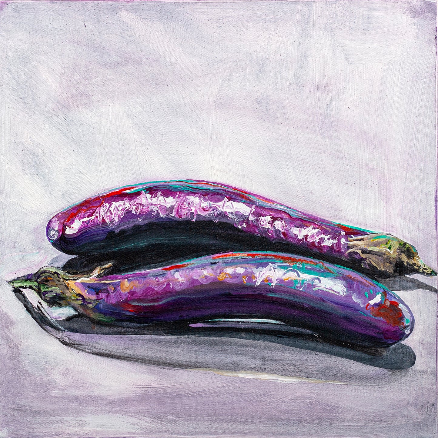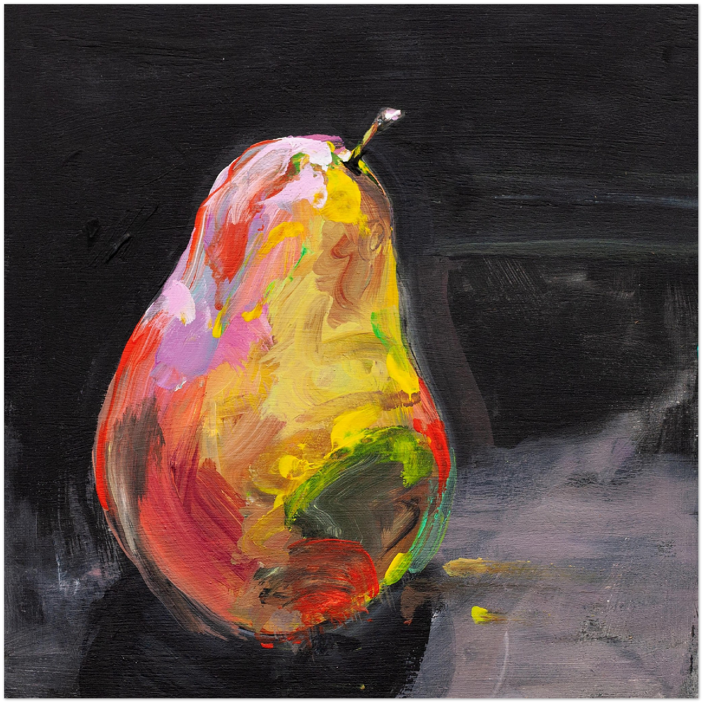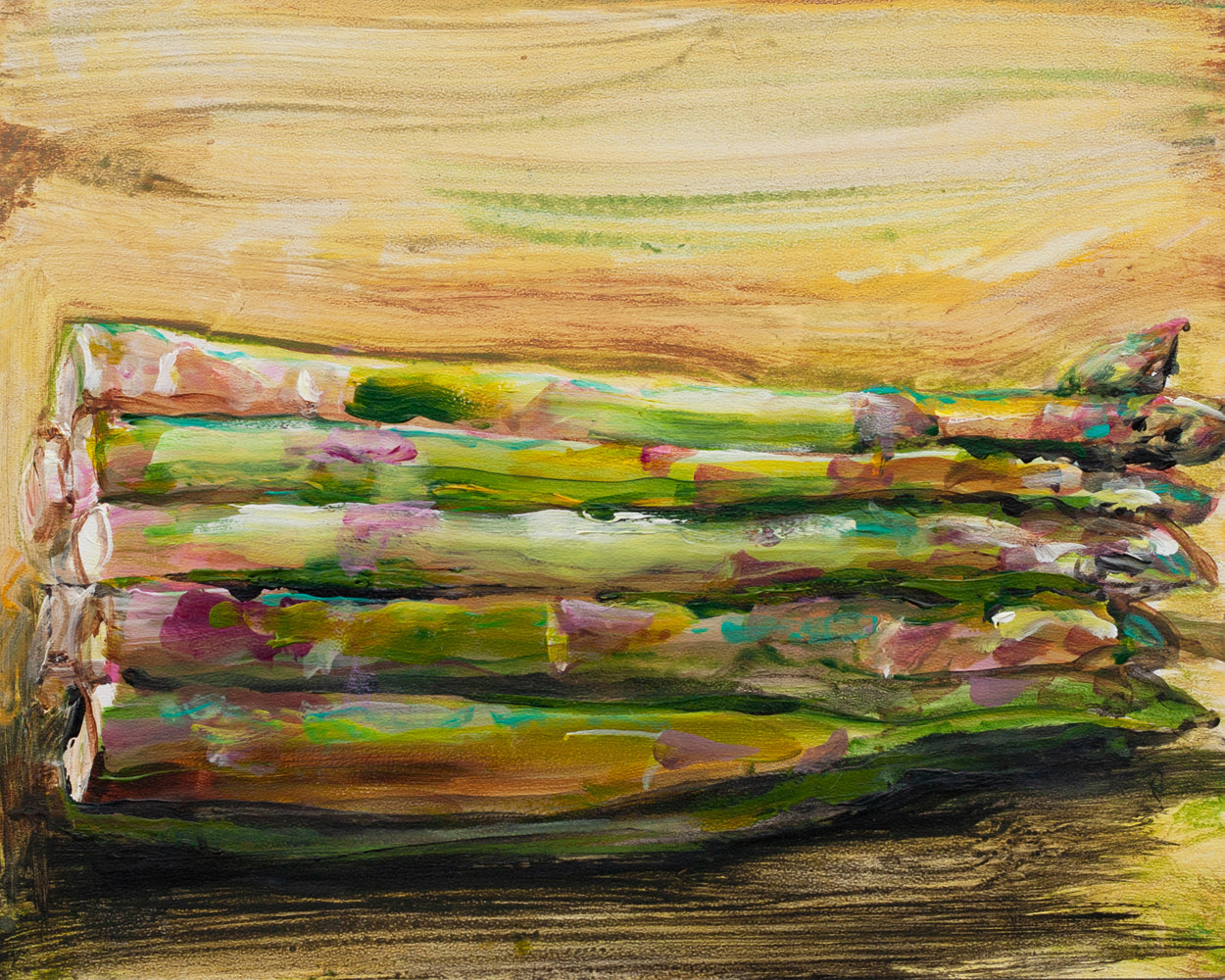 Her fascination with the visible yet rarely seen colours in nature continues with bold interpretations of still life. These bright acrylics are sometimes juxtaposed against dark surfaces, making the contrast even more stark.