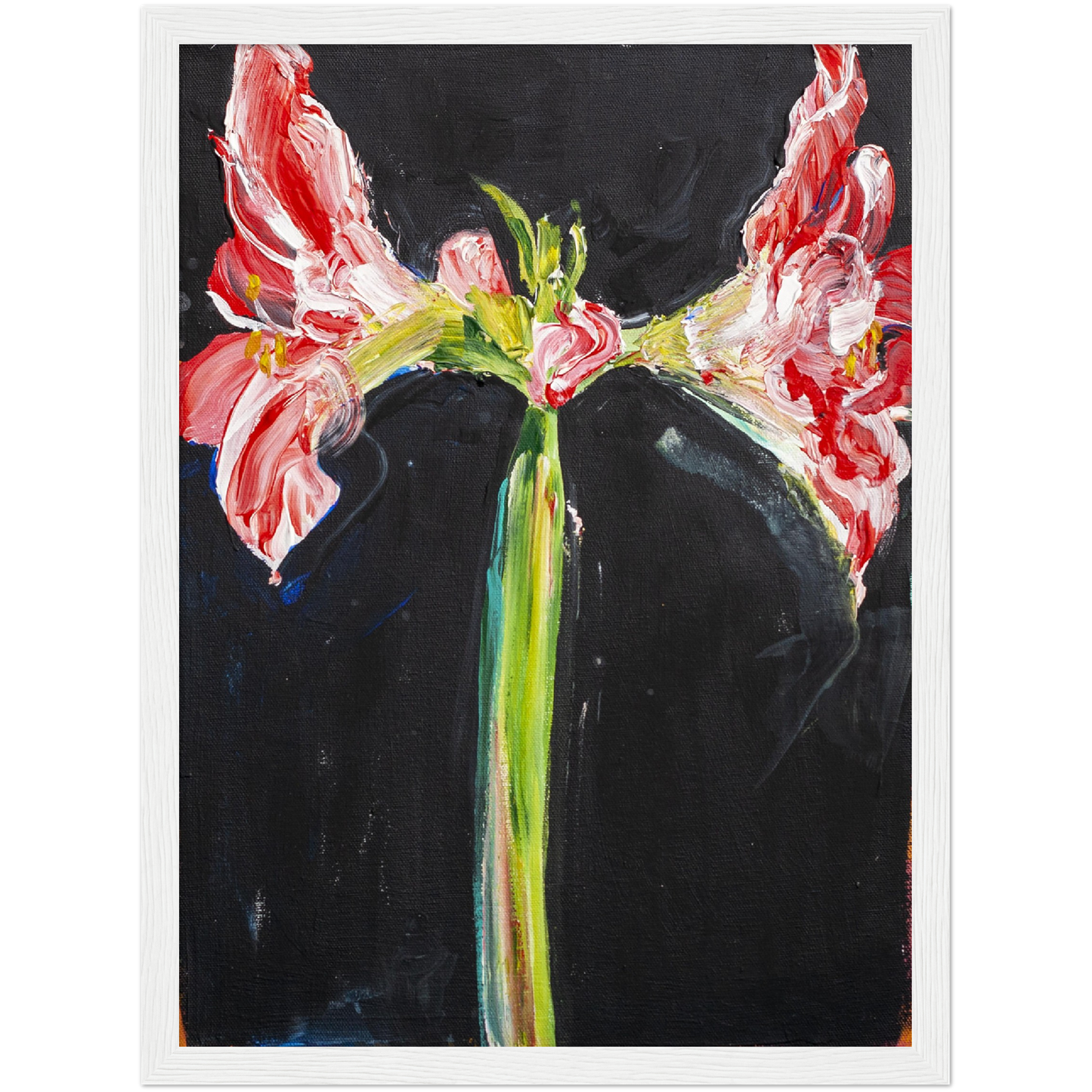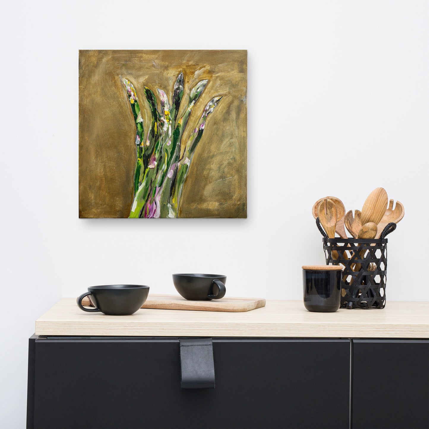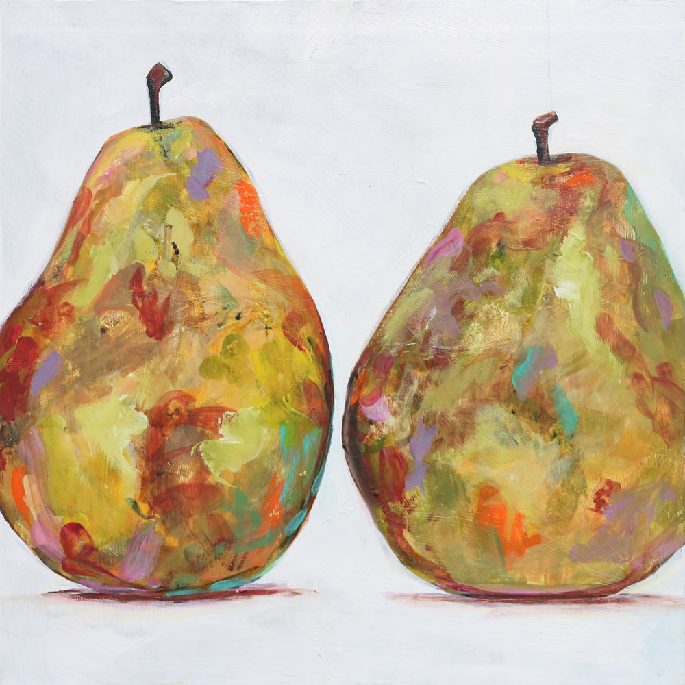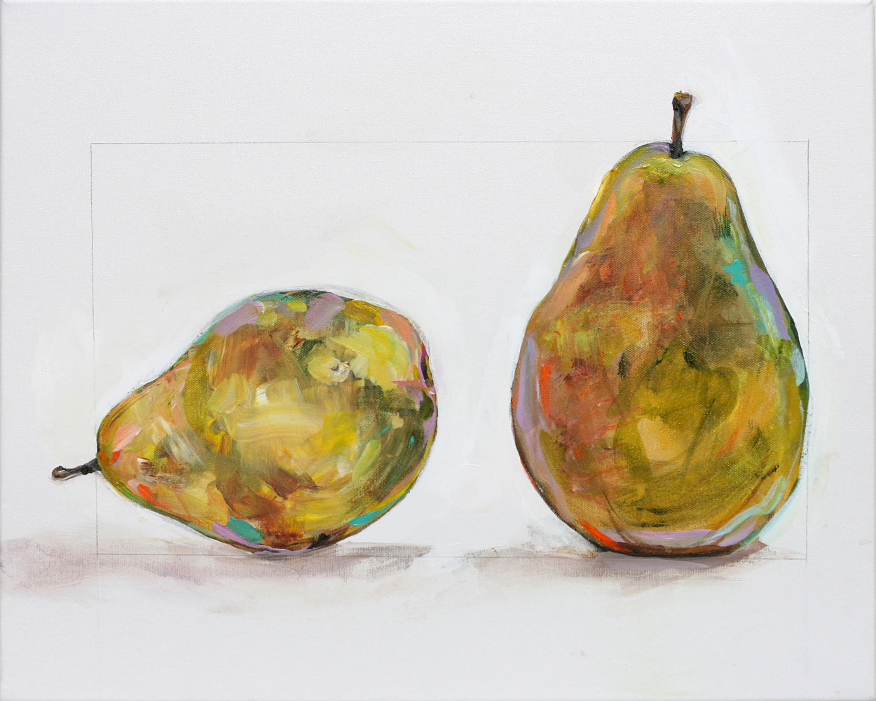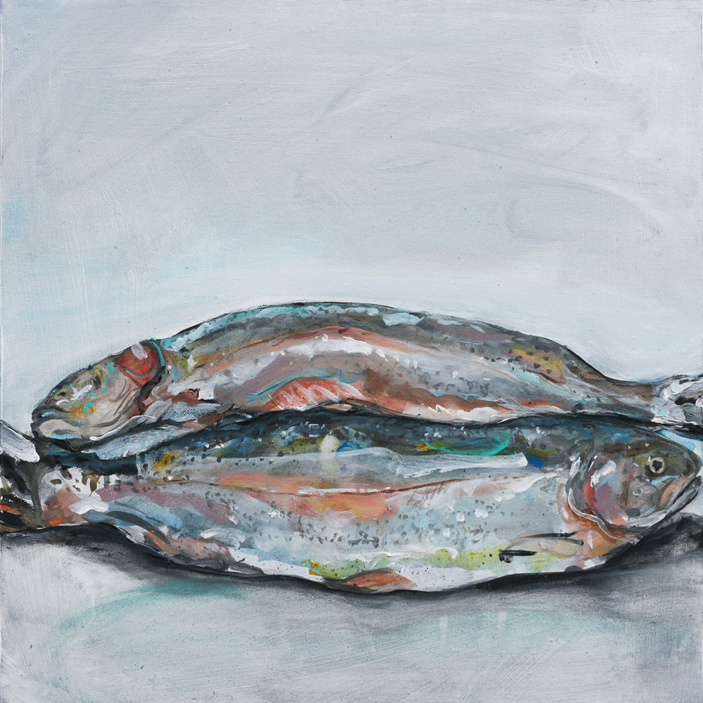 Her fascination with the visible yet rarely seen colours in nature continues with bold interpretations of still life. These bright acrylics are sometimes juxtaposed against dark surfaces, making the contrast even more stark.